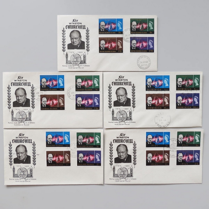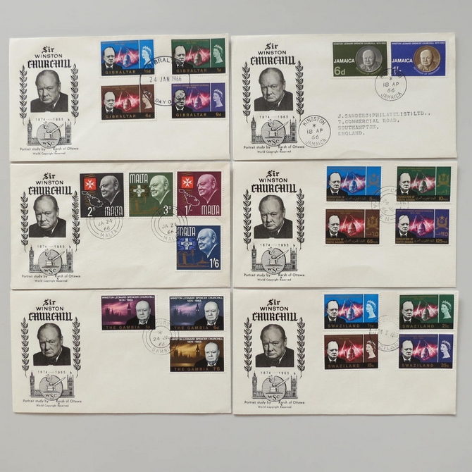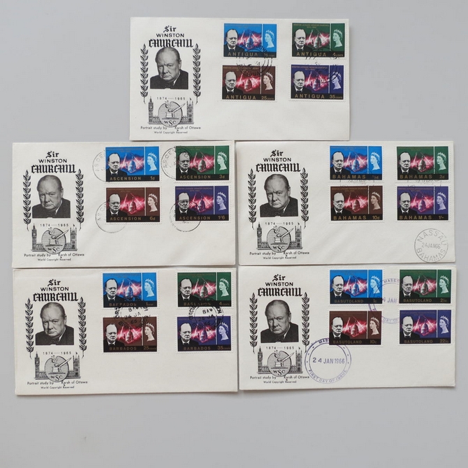 This 1966 Sir Winston Churchill first day cover set is a worldwide issue consisting of 21 FDC's in the collection. It commemorates the life of Churchill. Countries of issue in the collection are as follows: Antigua, Ascensions, Bahamas, Barbados, Basutoland, Bechuanaland, Bermuda, British Antarctic Territory, British Honduras, British Solomoon Islands, Brunei, Cayman Islands, Dominica, Falkland Islands, Federation of South Arabia, Fiji, Gibraltar, Jamaica, Malta, Swaziland and The Gambia.