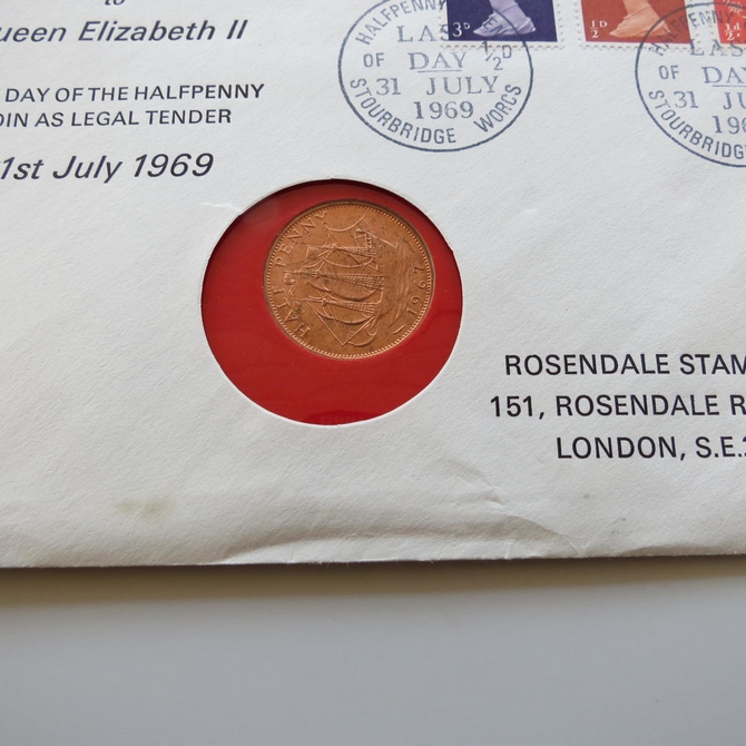 This 1969 Last Day of Half Penny coin cover is issued in UK as PNC First Day Covers by Rosendale Stamps. It hosts a 1967 Elizabeth II half penny and Royal Mail stamps. The cover is pre-owned. Postmark cancelled dated 31st July 1969.