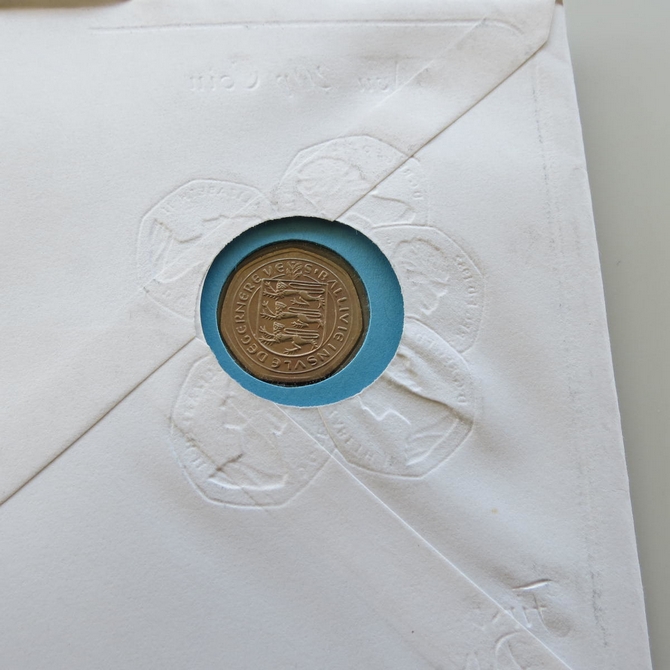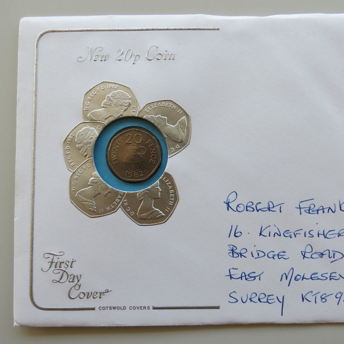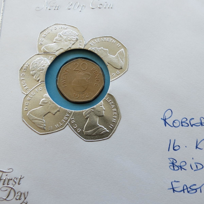 This 1982 New 20p pence coin coin cover is issued by Guernsey as PNC First Day Covers. It hosts a brilliant uncirculated twenty pence coin and a Guernsey Bailiwick stamp. The cover is pre-owned.
