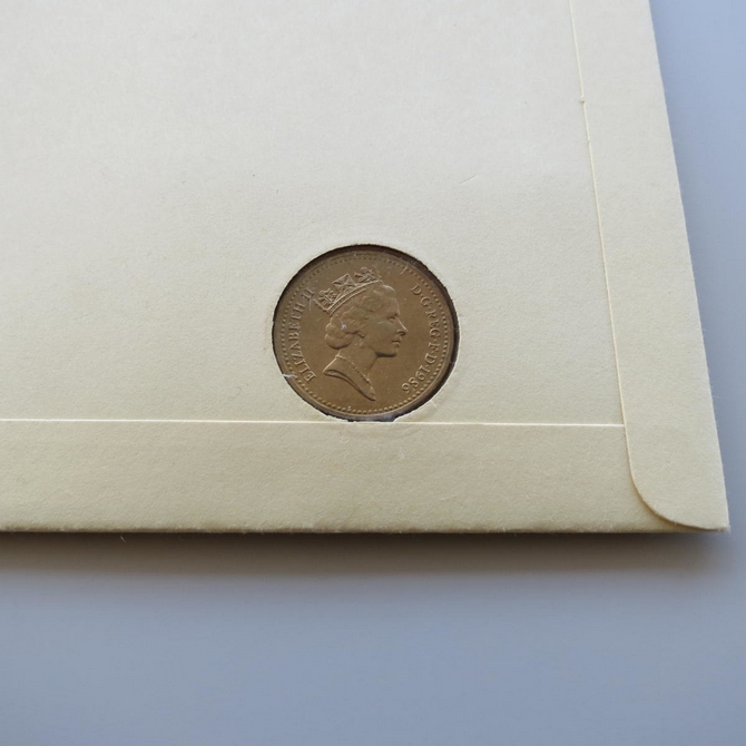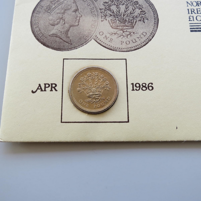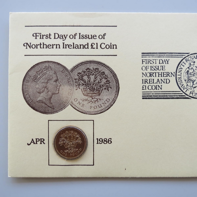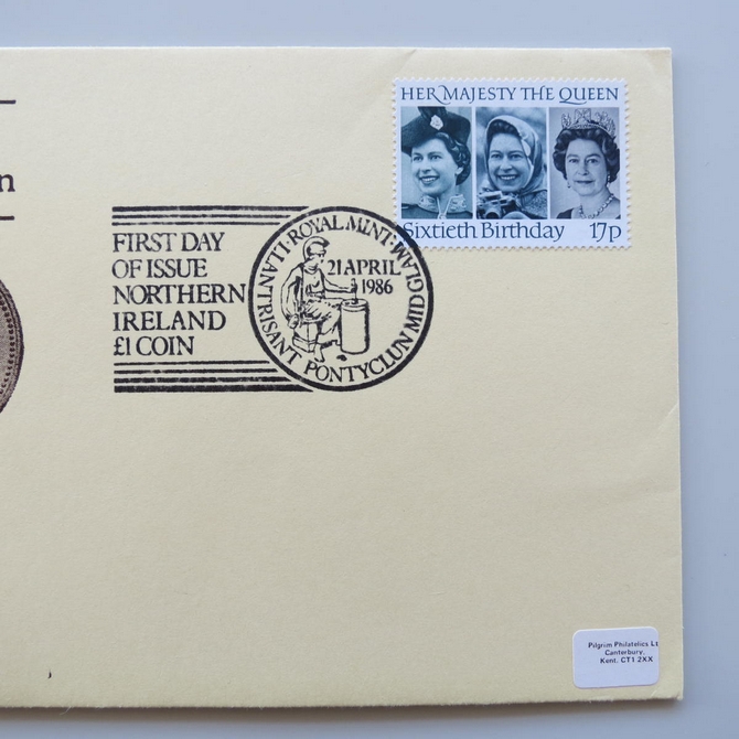 This 1986 Northern Ireland one pound coin cover is issued in UK as PNC First Day Covers by Pilgrim Philatelics. It hosts a brilliant uncirculated 1 pound coin and a Royal Mail stamp. The cover is pre-owned. Postmark cancelled dated 21st April 1986.