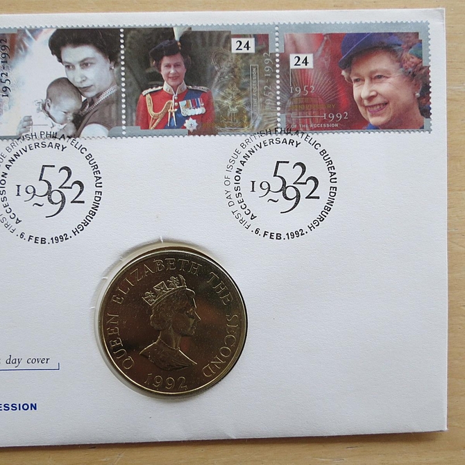 This 1992 40th Anniversary Accession HM QEII 2 pounds coin cover is a UK first day cover. It commemorates Her Majesty's 40th anniversary to the Accession to the throne and hosts a Alderney 2 pounds coin and Royal Mail stamps. Cancelled postmark Accession Anniversary First Day of Issue Edinburgh 6th February 1992.