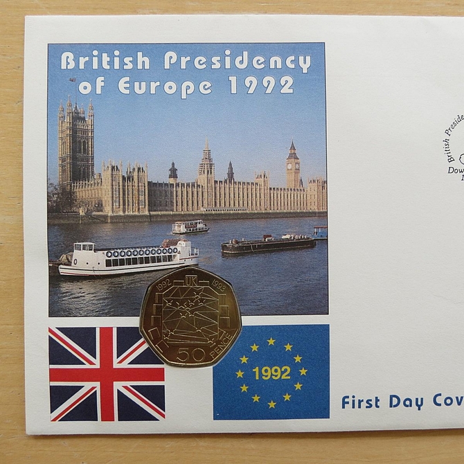 This 1992 British Presidency of Europe 50p Coin Cover is a UK first day cover. It hosts a brilliant uncirculated 50p coin by the Royal Mint and a Royal Mail stamp. The cover commemorates the completion of the European Single market and Britain's 1992 Presidency of the Council of Ministers. Cancelled postmark British Presidency The European Community Downing street London SW1 13th October 1992.