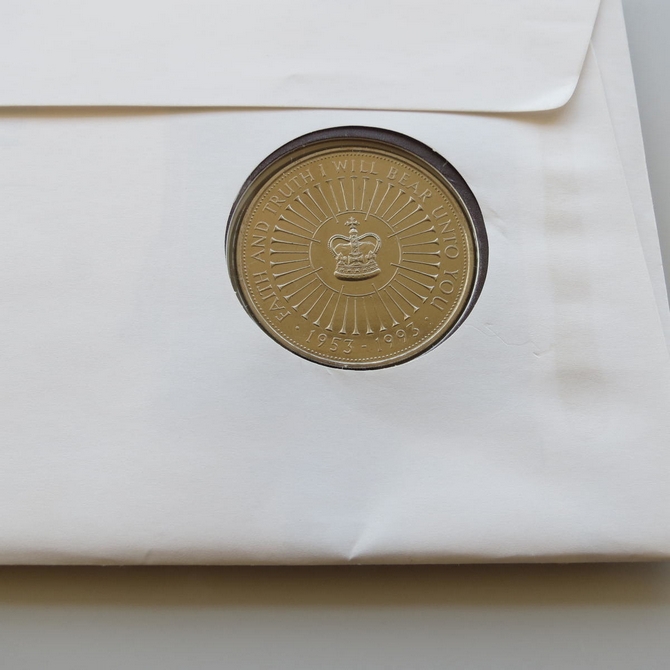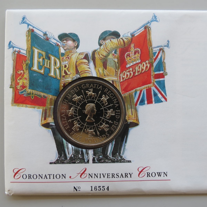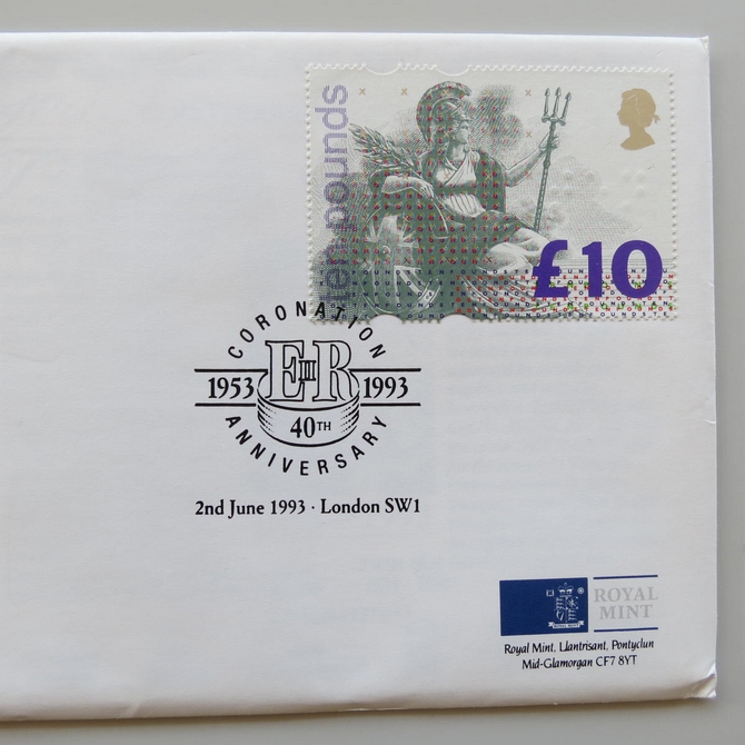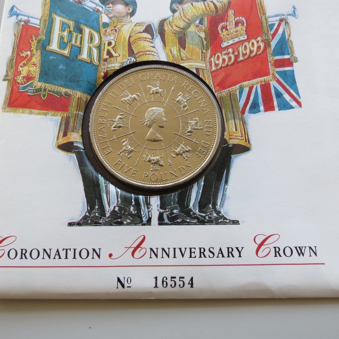 This 1993 40th Coronation anniversary 5 pounds coin cover is a Royal Mint first day cover. It commemorates Her Majesty's 40th coronation anniversary and hosts a brilliant uncirculated 5 pounds coin by the Royal Mint and a Royal Mail 10 pounds stamp. Cancelled postmark Coronation 1953 - 1993 40th Anniversary 2nd June 1993 London SW1.