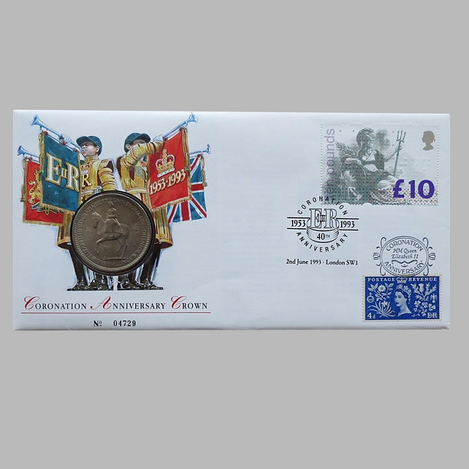 This 1993 40th anniversary Coronation 5 shillingss coin cover was issued by the Royal Mint. It commemorates the 40 years reign of Her Majesty Queen Elizabeth II since her Coronation and hosts a five shillings coin and Royal Mail stamps. Cancelled postmark EiiR 1953 - 1993 40th Coronation Anniversary London SW1 2nd June 1993.