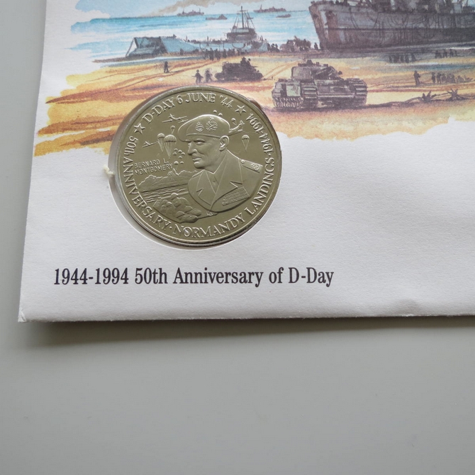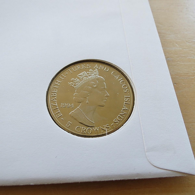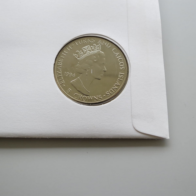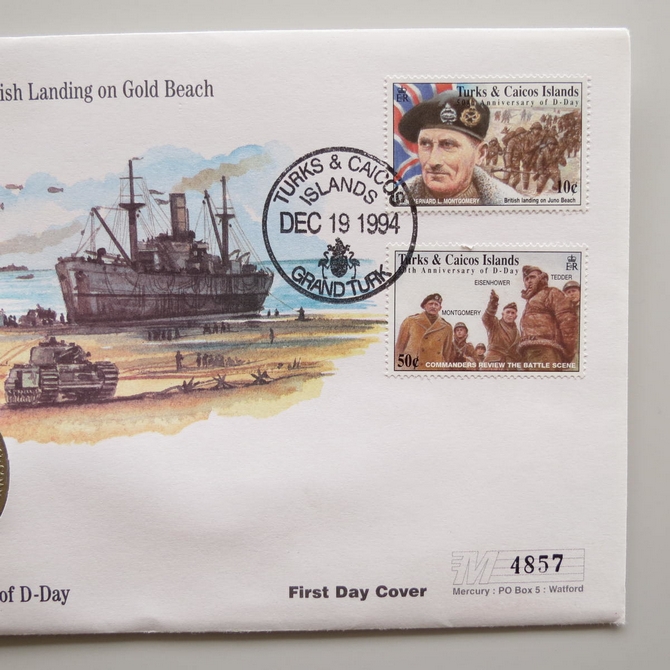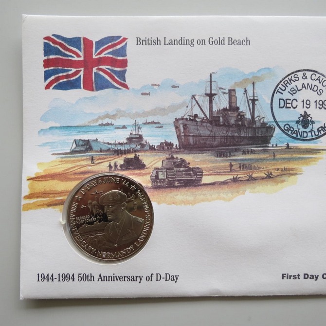 This 1994 D-Day 50th anniversary Gold Beach 5 crown coin cover is a Turks & Caicos first day cover. It commemorates 50 years of D-Day landings on Gold Beach and hosts a 5 crown coin and Grand Turks stamps. The brilliant uncirculated coin features General Bernard Montgomery. Cancelled postmark Turks & Caicos Islands Grand Turk 19th December 1994.
