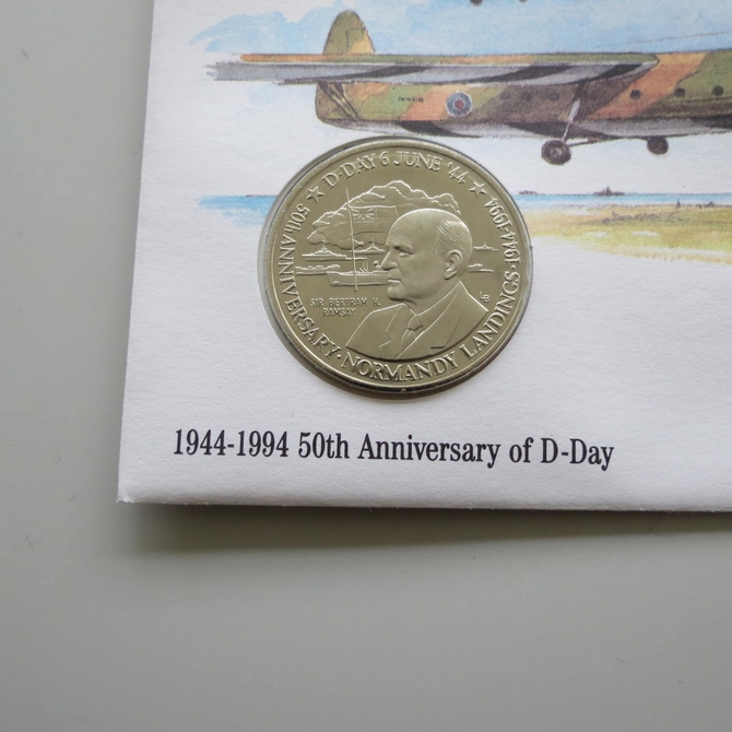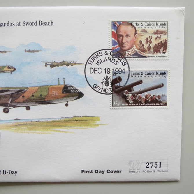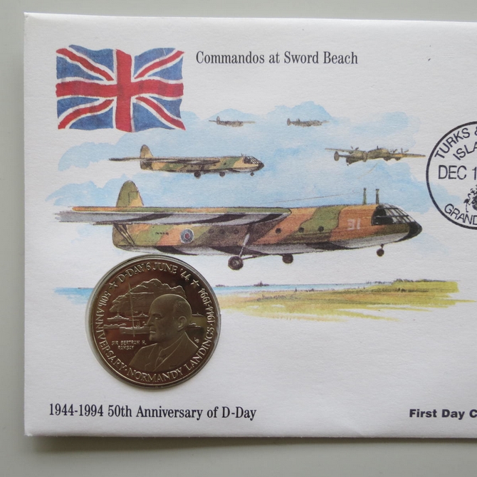 This 1994 D-Day Landings 50th anniversary Sword beach 5 crowns coin cover is a Grand Turk first day cover. It commemorates the 50th anniversary of D-Day landings named Sword beach and hosts a brilliant uncirculated 5 crowns coin and Turks & Caicos Islands stamps. Cancelled postmark dated 19th December 1994.