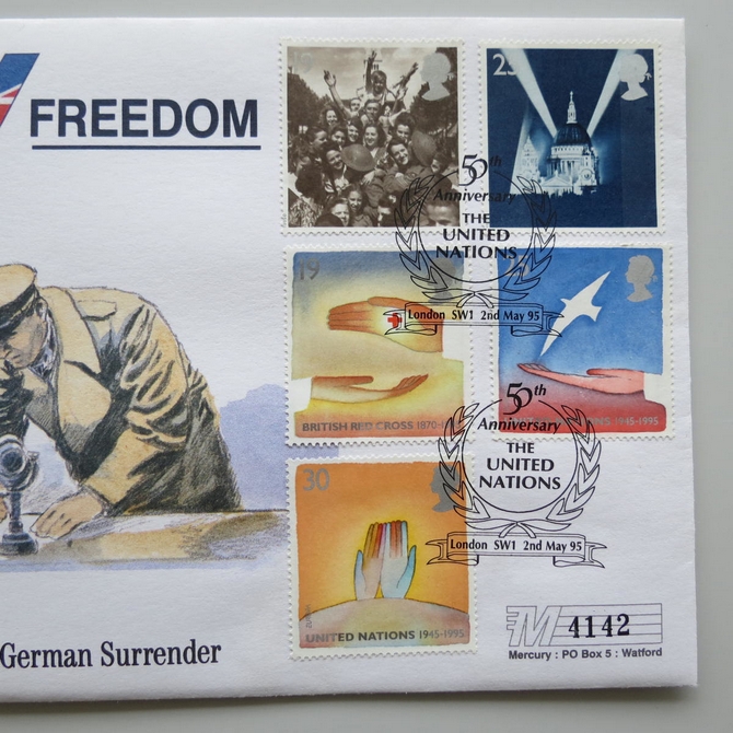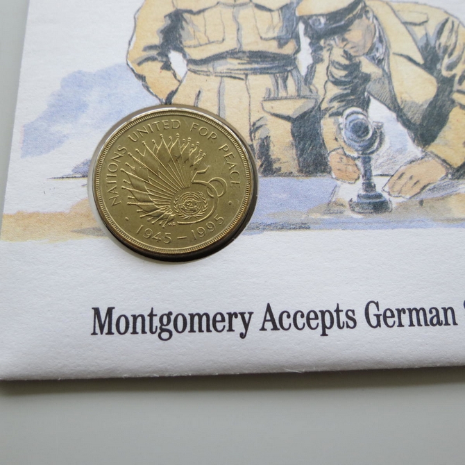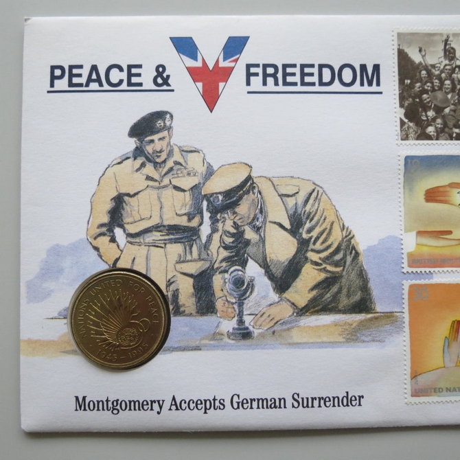 This 1995 United Nations Peace & Freedom 2 pounds coin cover is issued by UK as PNC first day covers. It commemorates the 50th anniversary of United Nations peace in Europe and hosts a brilliant uncirculated two pounds coin and Royal Mail stamps. Cancelled postmark 50th Anniversary United Nations London SW1 2nd May 1995.