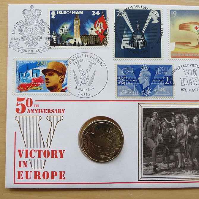 This 1995 VE Day 50th anniversary 2 pounds coin cover is a Benham first day cover. It celebrates the 50th anniversary of Victory In Europe Day and hosts a brilliant uncirculated 2 pounds coin, Royal Mail stamps, an Isle of Man stamp and a stamp from France. Cancelled postmark 50th Anniversary Victory in Europe Whitehall SW1 2nd May 1995.