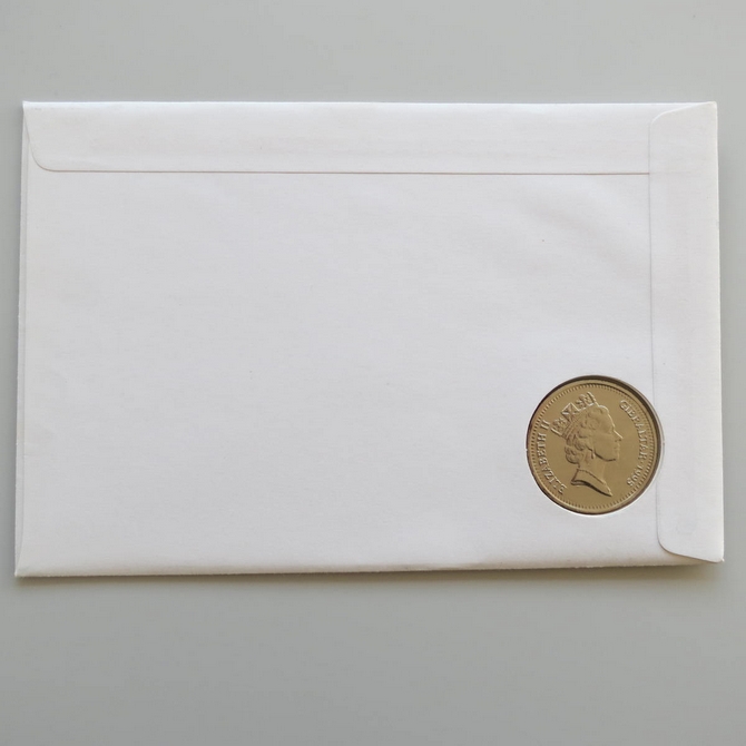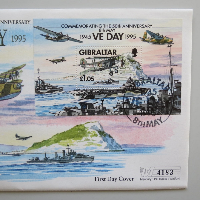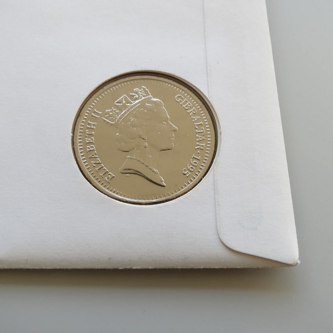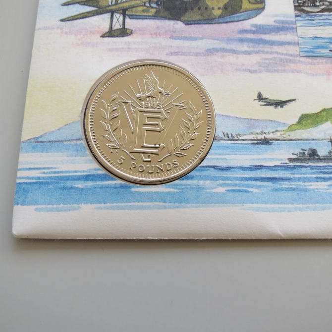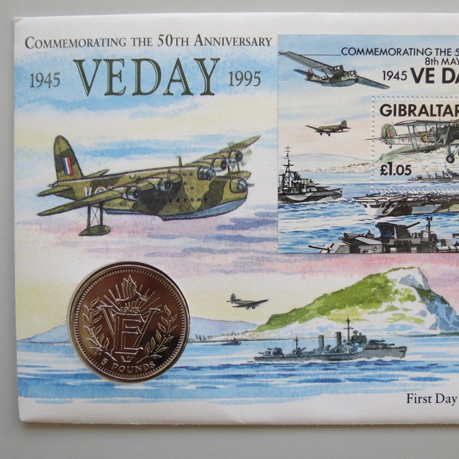 This 1995 VE Day 50th anniversary 5 pounds coin cover is issued by Gibraltar as PNC First Day Covers. It commemorates the 50 years of Victory in Europe and hosts a brilliant uncirculated five pounds coin with inscription VE and a stamp cachet reflecting the celebrations in air and sea. Cancelled postmark VE DAY GIBRALTAR 8th May 1995.