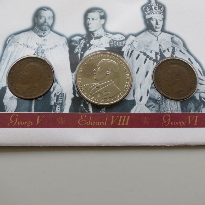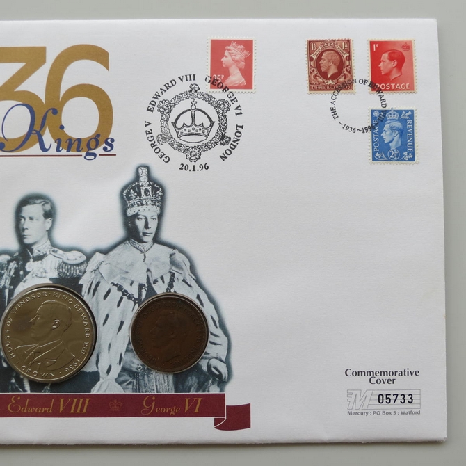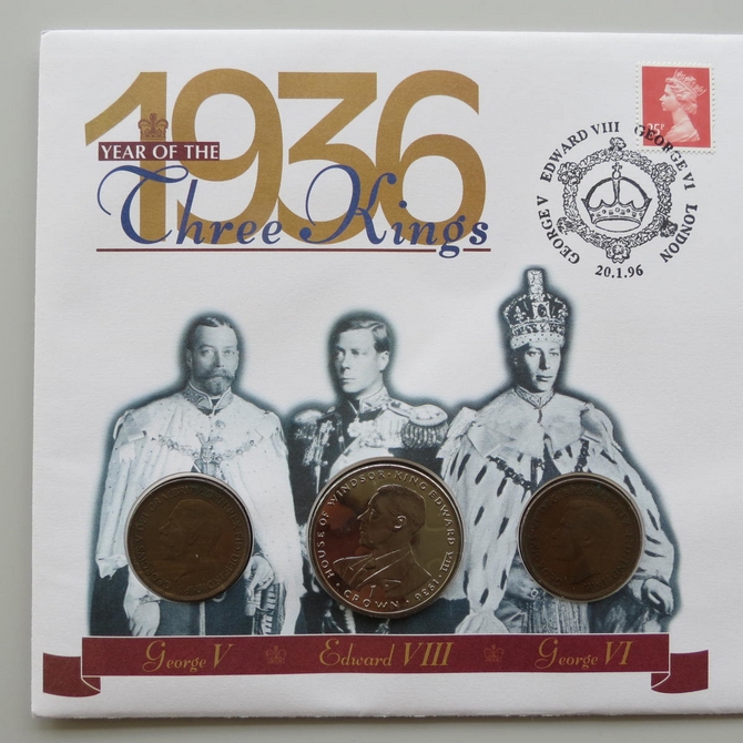 This 1996 1936 Year of Three Kings 60th anniversary coin cover is issued by UK as PNC First Day Covers. It commemorates the year 1936 where the United Kingdom had three kings and hosts multi coins: authentic penny from the reign of both George V and VI and a 1 crown coin of King Edward VIII. Four Royal Mail stamps from each of the kings in 1936 and the current monarch are placed on the cover. Cancelled postmark George V Edward VIII George VI London 20th January 1996.