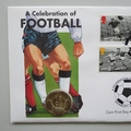 This 1996 A Celebration of Football 2 pounds coin cover is a first day cover by Mercury. It celebrates football as the world's most popular game and hosts a brilliant uncirculated two pounds coin by the Royal Mint and stamps by Royal Mail. The stamps show past football legends and the coin depicts a football with inscription 1996. Postmark cancelled A Celebration of Football Wembley 14th May 1996.