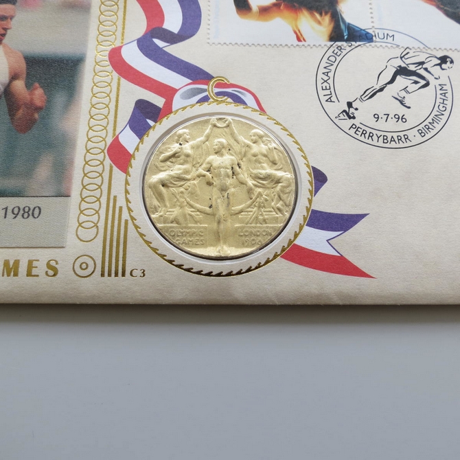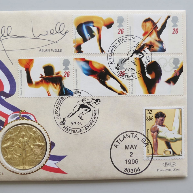 This 1996 Centennial Olympic Games Gold Medal Winners first day PNC cover is hand signed by Allan Wells and issued by Benham Covers. It celebrates the gold medal won by him in the sport of Athletics 100m in 1980. The cover hosts a replica gold medal and sports stamps from Royal Mail UK and USA. Postmark cancelled dated 9th July 1996.