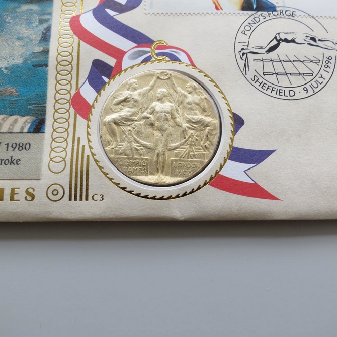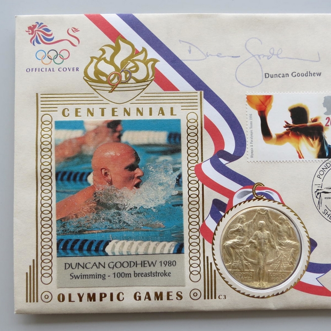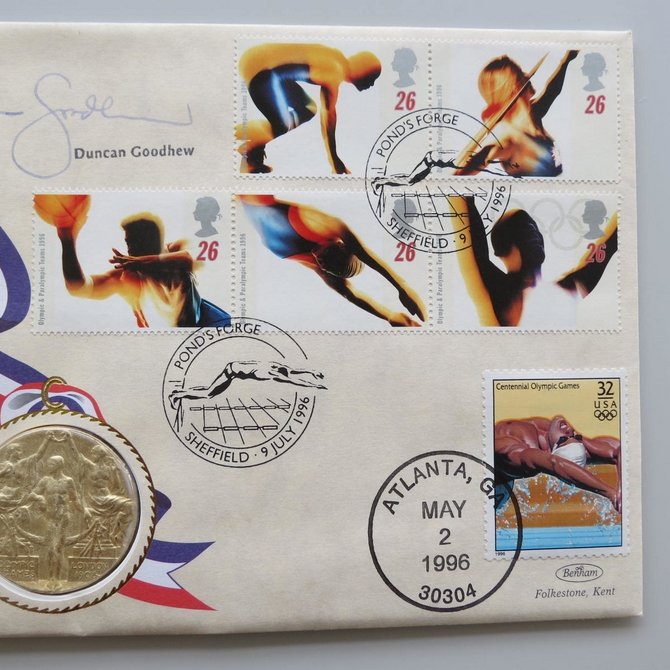 This 1996 Centennial Olympic Games Gold Medal Winners first day PNC cover is hand signed by Duncan Goodhew and issued by Benham Covers. It celebrates the gold medal won by him in the sport of Swimming 100m Breaststroke in 1980. The cover hosts a replica gold medal and sports stamps from Royal Mail UK and USA. Postmark cancelled dated 9th July 1996.