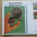 This 1996 European Football 5 pounds coin cover is a Guernsey first day cover by Mercury. It celebrates the past European football championships and hosts a 5 pounds coin and Guernsey stamps. The brilliant uncirculated coin features the map of Europe and a football. Cancelled postmark European Football Guernsey Post Office 25th April 1996.