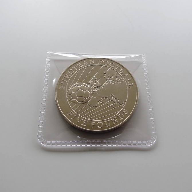 This 1996 European Football brilliant uncirculated 5 pounds coin was issued by Guernsey. It celebrates the UEFA football championship and the coin depicts the map of Europe and a football. The coin is presented in a clear plastic sleeve and is pre-owned.