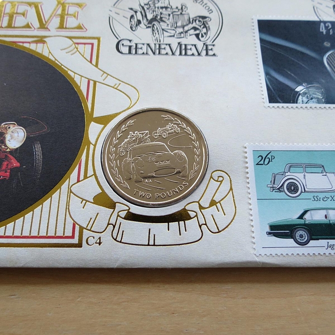 This 1996 Jaguar Classic Cars 100 years of motoring 2 pounds coin cover is a Benham first day cover. It celebrates the Jaguar car, the centenary of London to Brighton motor rally and hosts a brilliant uncirculated Isle of Man two pounds coin and Royal Mail stamps featuring the Jaguar XJ6 & Jaguar SSr classic motor cars. The cover is hand signed by Dinah Sheridan. Cancelled postmark London to Brighton Car Rally Centenary Year 1896-1996 Brighton 1st October 1996 and London to Brighton Commemoration Run Brighton 3rd November 1996.