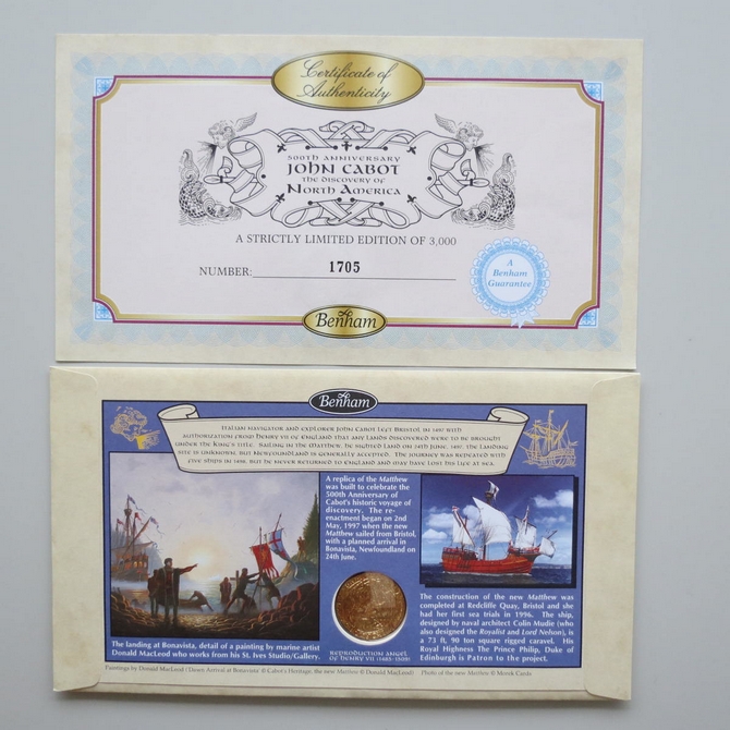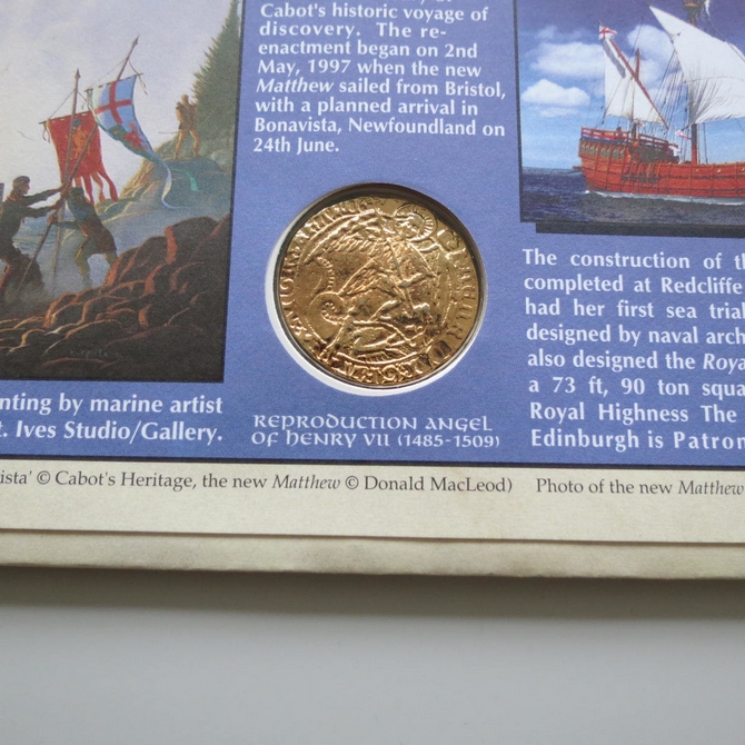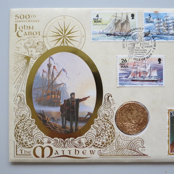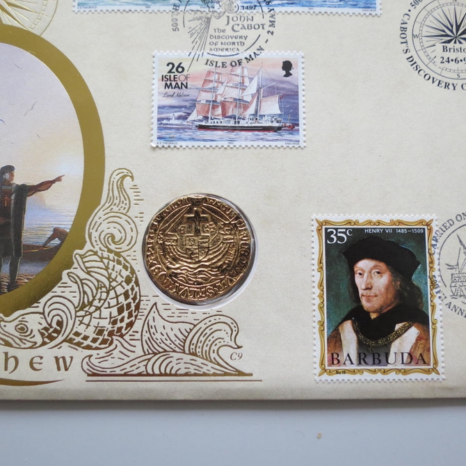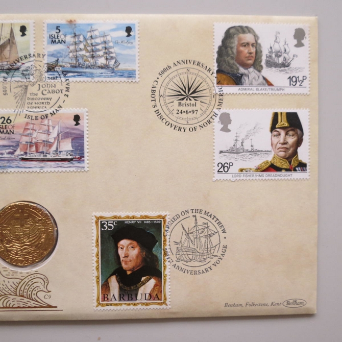 This 1997 Cabot's discovery of North America 500th anniversary coin cover is a Benham first day cover. It commemorates John Cabot's journey of discovery and hosts a reproduction Angel of Henry VII coin and Royal Mail and Isle of Man stamps. Cancelled postmark Cabot's Discovery of North America 500th Anniversary Bristol 24th June 1997.