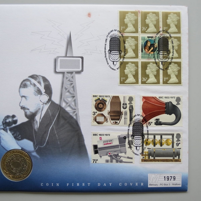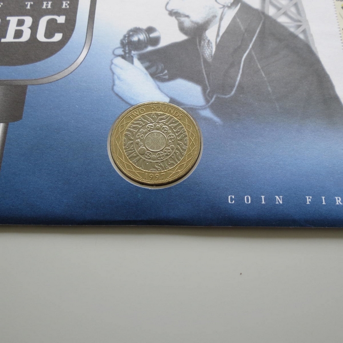 This 1997 75 Years of the BBC 2 pounds coin cover is issued by UK as PNC first day covers. It host a brilliant uncirculated two pounds coin by the Royal Mint and Royal Mail stamps all commemorating the 75th anniversary of the British Broadcasting Corporation. Postmark cancelled 75Years of the BBC, BBC Broadcasting House London W12 7TS 23rd September 1997.