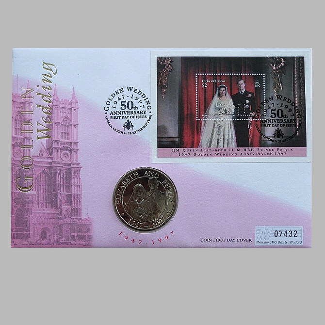 This 1997 Golden wedding anniversary 5 crowns coin cover is a Grand Turks first day cover. It commemorates the Golden wedding anniversary of Her Majesty The Queen and hosts a brilliant uncirculated 5 crowns coin and a stamp from Turks & Caicos Islands. Cancelled postmark Golden Wedding 1947 - 1997 50th Anniversary First Day of Issue Turks & Caicos Islands Grand Turk 21st April 1997.