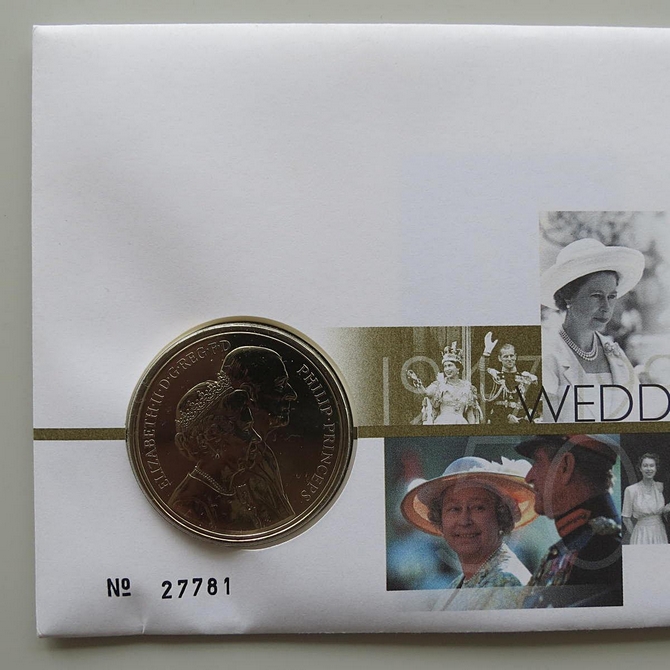 This 1997 golden wedding anniversary HM QEII 5 pounds coin cover is a Royal Mint first day cover. It commemorates the 50th wedding anniversary of Her Majesty and HRH Prince Philip and hosts a brilliant uncirculated 5 pounds coin and four Royal Mail stamps that portray photographs of Her Majesty and HRH Duke of Edinburgh. Cancelled postmark Golden 50th City of Westminster London SW1 28th November 1997.