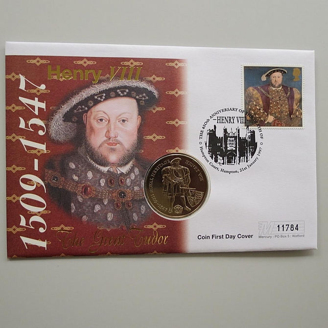 This 1997 Great Tudor King Henry VIII 2 pounds coin cover is issued by Westminster Collection as First Day Covers. It commemorates the 450th death anniversary of King Henry VIII and hosts a BU Falkland Islands 2 pounds coin and a Royal Mail stamp both depicting the Tudor King. Postmark cancelled The 450th Anniversary of The Death of Henry Viii Hampton Court Hampton 21st January 1997.