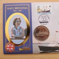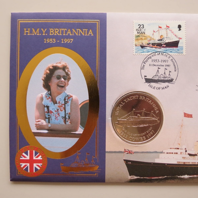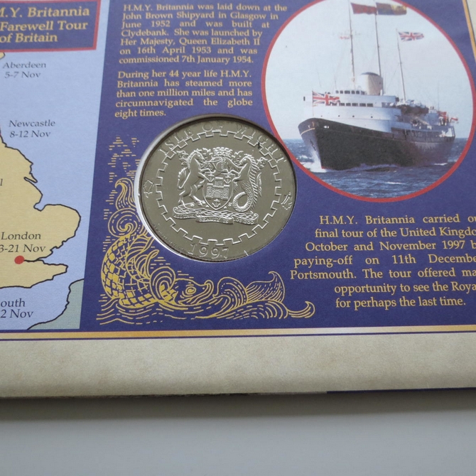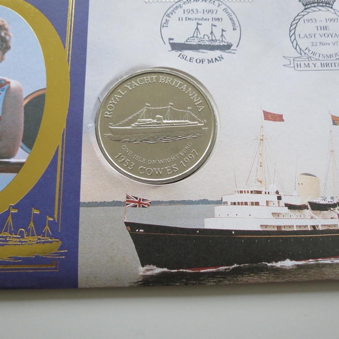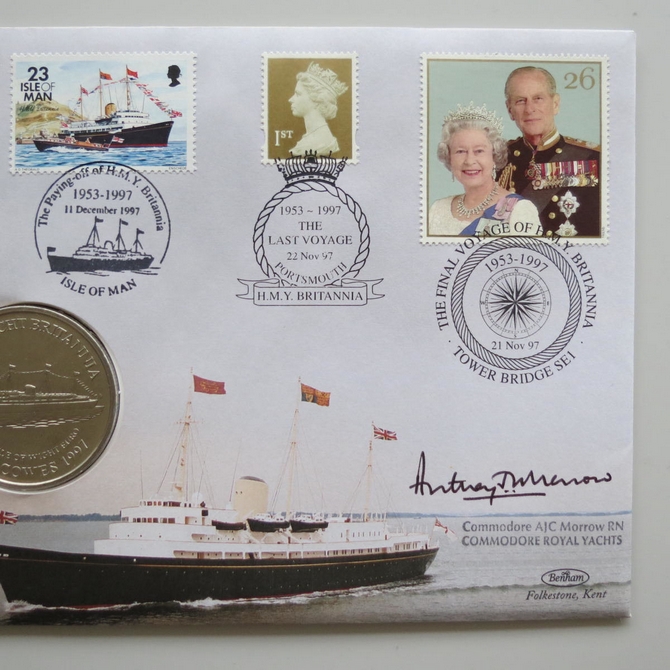 This 1997 HMY Britannia Last Voyage 1 euro coin cover is a Benham first day cover. It commemorates the Royal Yacht Britannia's last voyage and hosts a brilliant uncirculated Isle of Wight euro coin and stamps. The FDC is hand signed by AJC Morrow RN Commodore Royal Yachts. Cancelled postmark The Final Voyage of HMY Britannia Tower Bridge SE1 21st November 1997.