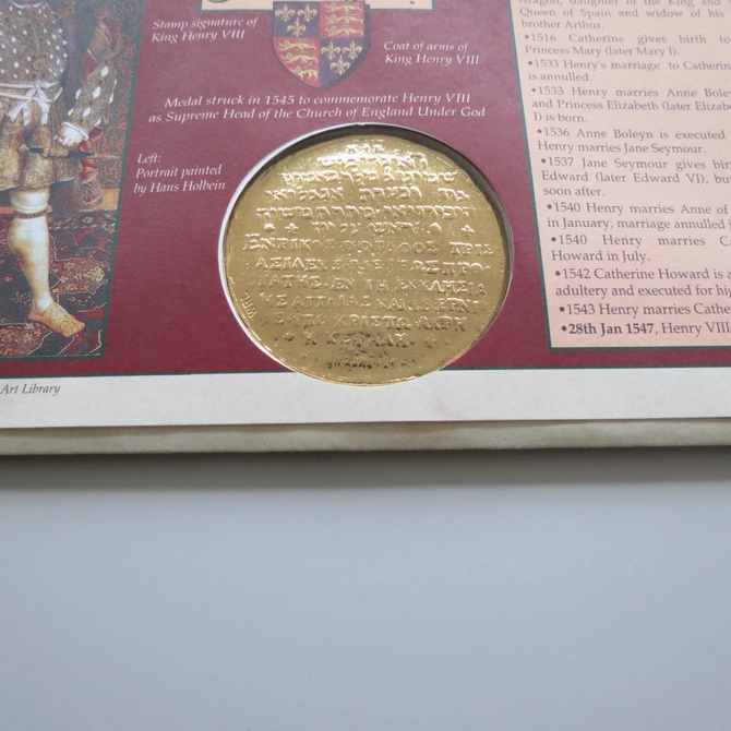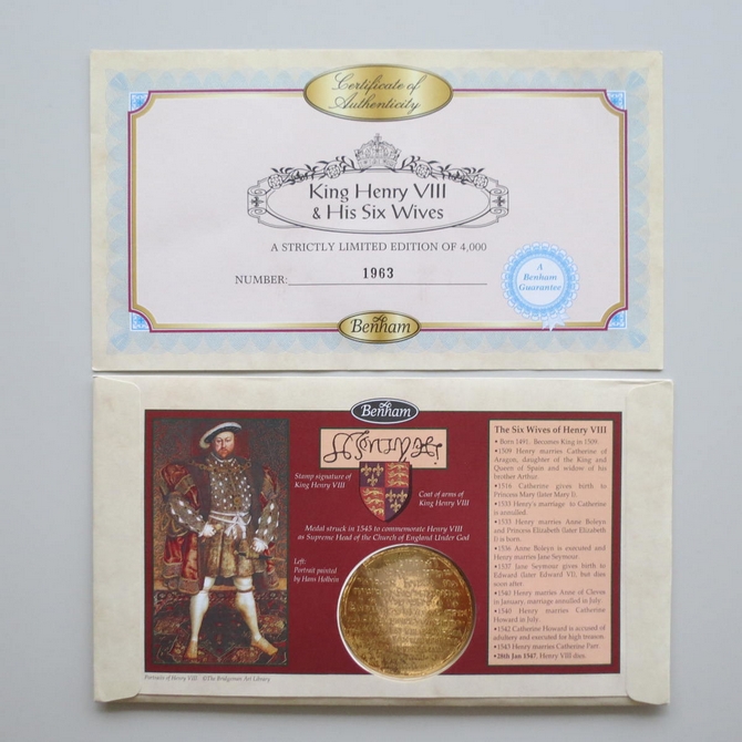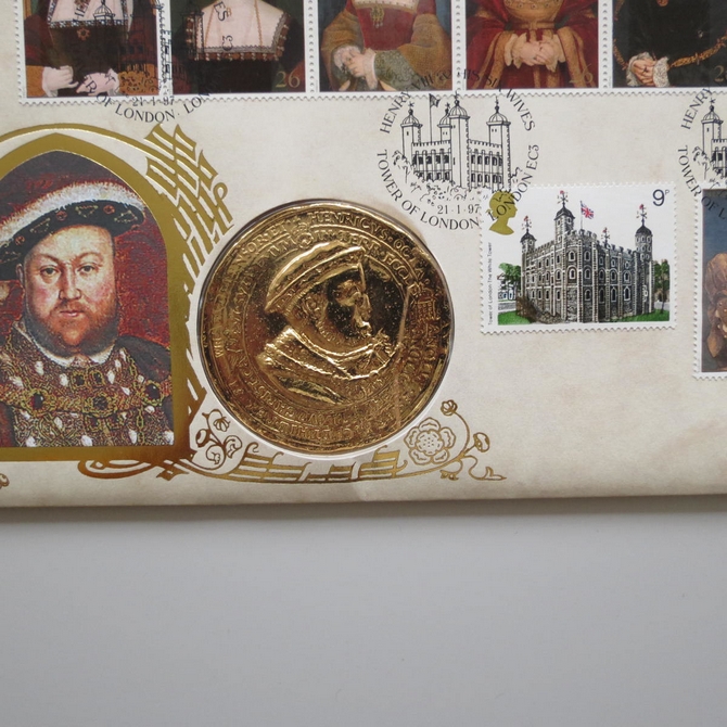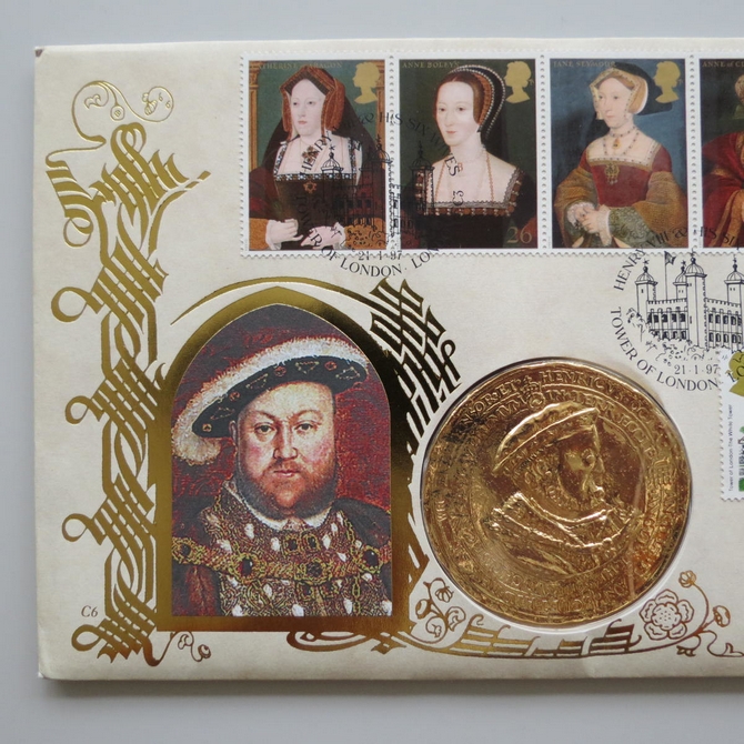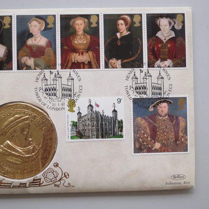 This 1997 King Henry VIII & His Six Wives medal cover is issued by Benham as first day covers. It commemorates the great Tudor King, King Henry VIII and his wives and hosts a medal together with Royal Mail stamps showing each of his six wives, the Tudor monarch and Hampton Court Palace. Cancelled postmark Henry VIII & His Six Wives Tower of London London EC3 21st January 1997.
