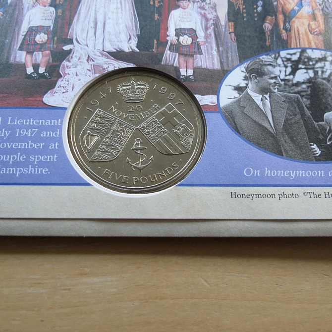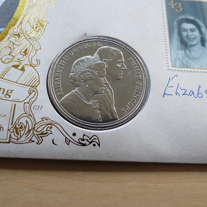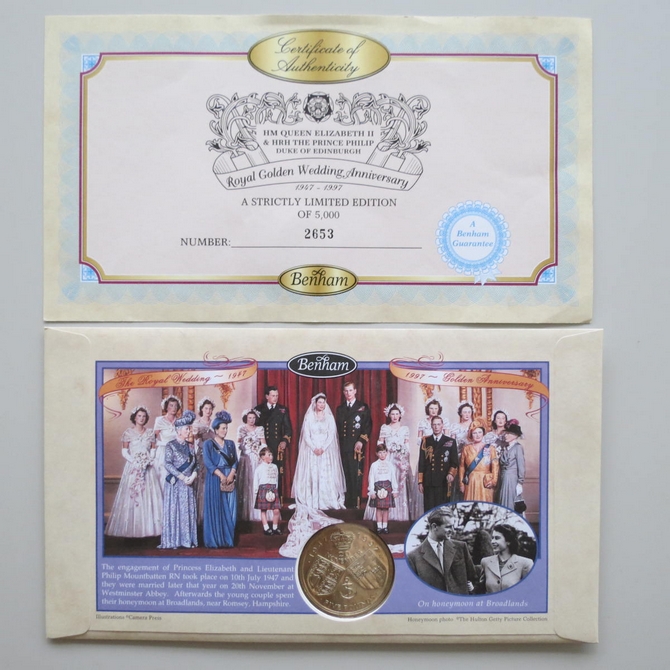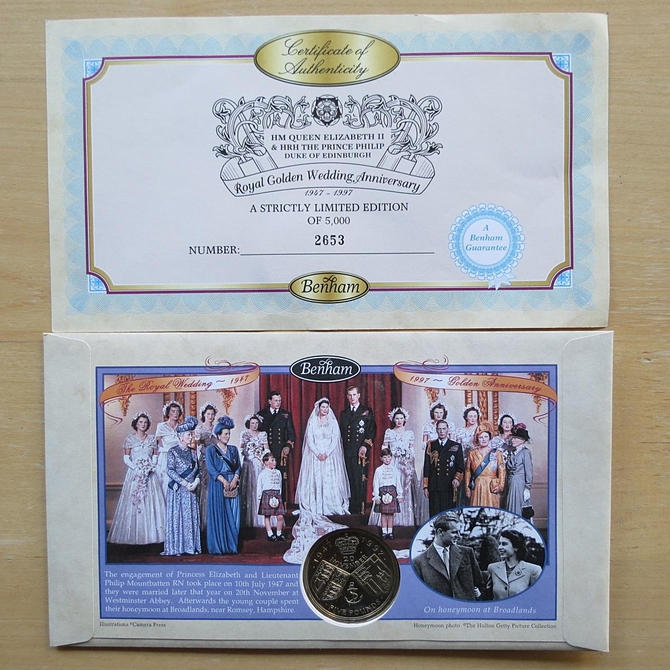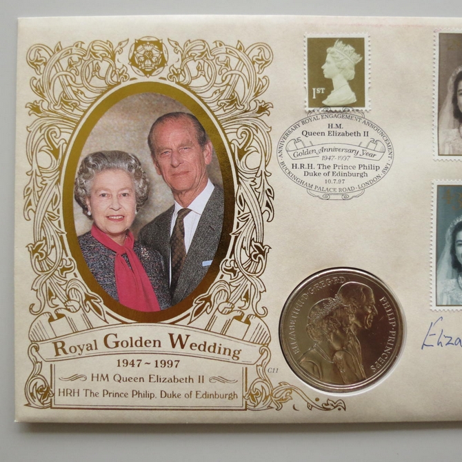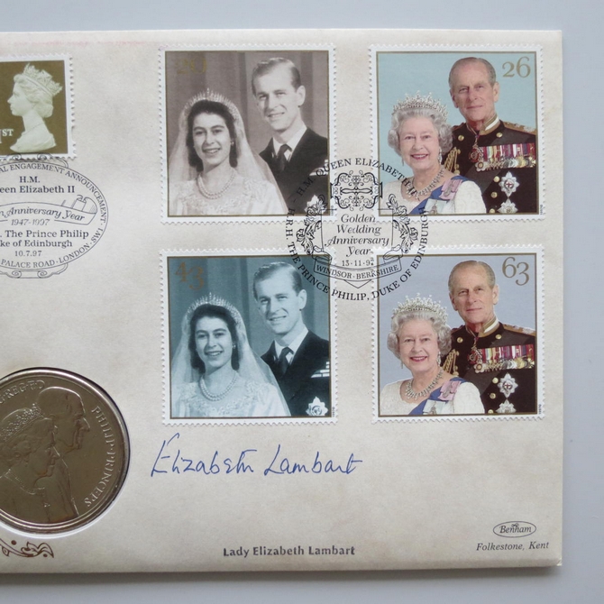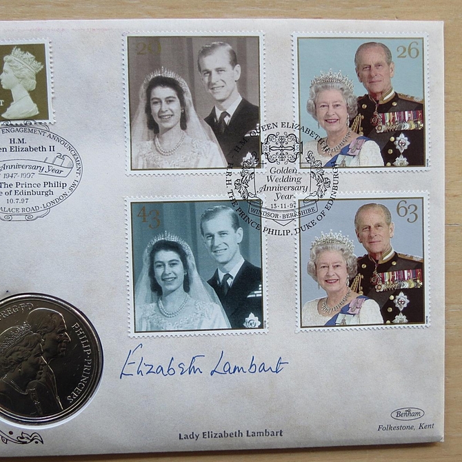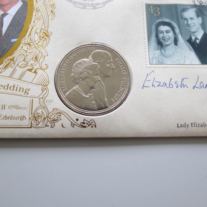 This 1997 Royal Golden wedding anniversary 5 pounds coin cover is a signed Benham first day cover. It commemorates the Golden wedding anniversary of HM Queen Elizabeth II and hosts a UK 5 pounds coin and Royal Mail stamps. The cover is hand signed by Elizabeth Lambart. Cancelled postmark HM Queen Elizabeth II HRH The Prince Philip Duke of Edinburgh Golden Anniversary Year Windsor Berkshire 13th November 1997.