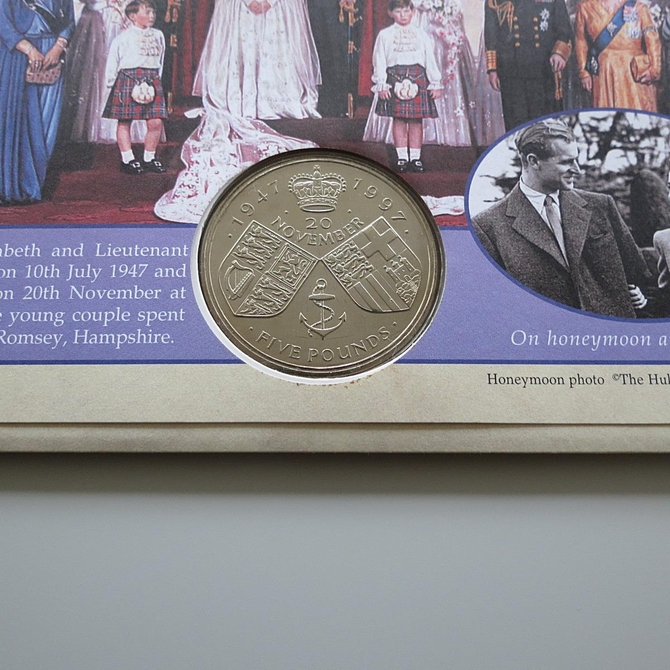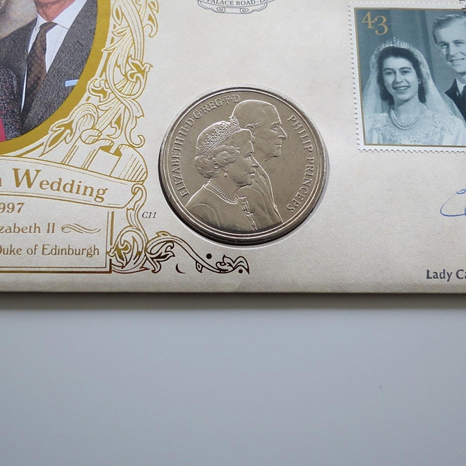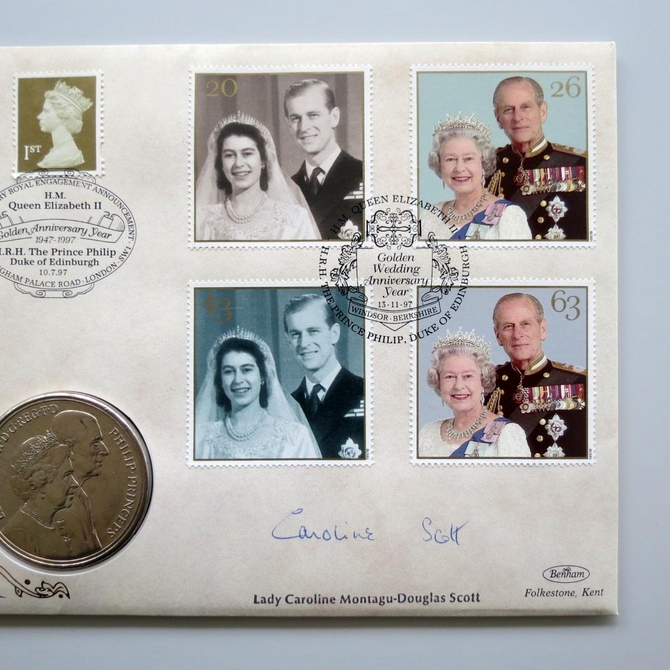 This 1997 Royal Golden Wedding anniversary 5 pounds coin cover is a Benham signed first day cover. It celebrates the wedding anniversary of HM Queen Elizabeth II and hosts a UK 5 pounds coin and Royal Mail stamps. The cover is hand signed by Caroline Scott. Cancelled postmark HM Queen Elizabeth II HRH The Prince Philip Golden Wedding Anniversary Year Windsor Berkshire.