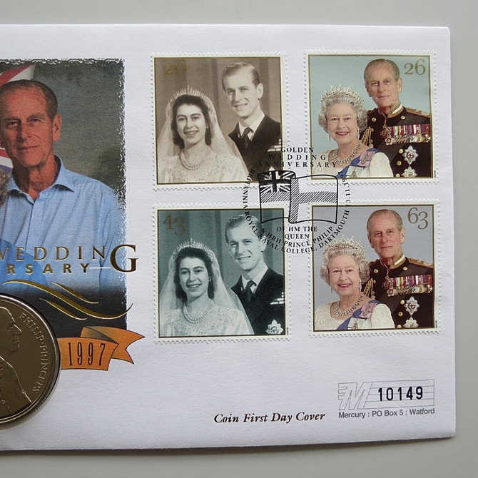 This 1997 The Queen's golden wedding anniversary 5 pounds coin cover is a UK first day PNC cover. It commemorates Her Majesty's golden wedding anniversary and hosts a five pounds coin and Royal Mail stamps depicting Her Majesty Queen Elizabeth II and HRH Prince Philip. Cancelled postmark Golden Wedding Anniversary of HM The Queen & HRH Prince Philip Britannia Royal Naval College Dartmouth 13th November 1997.