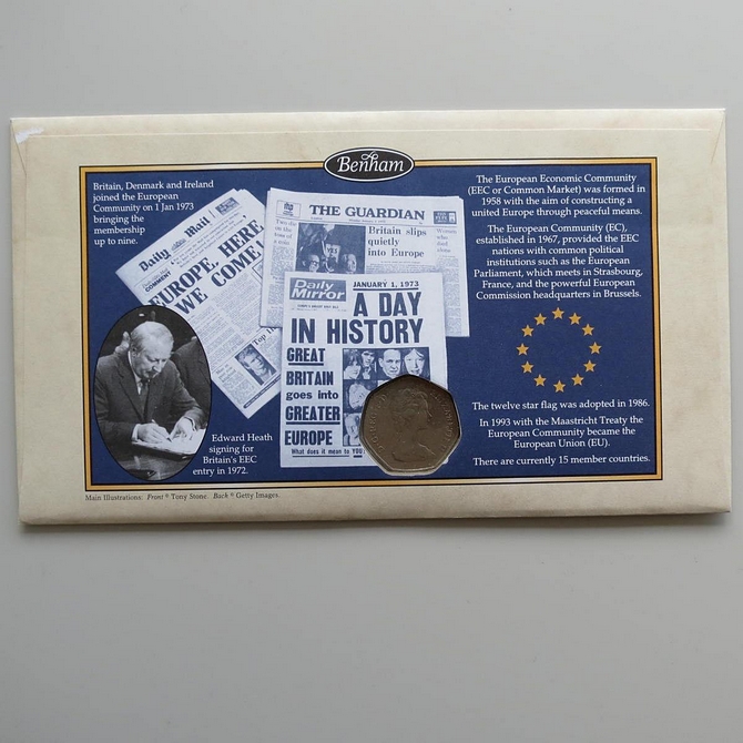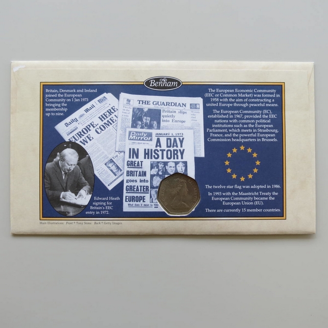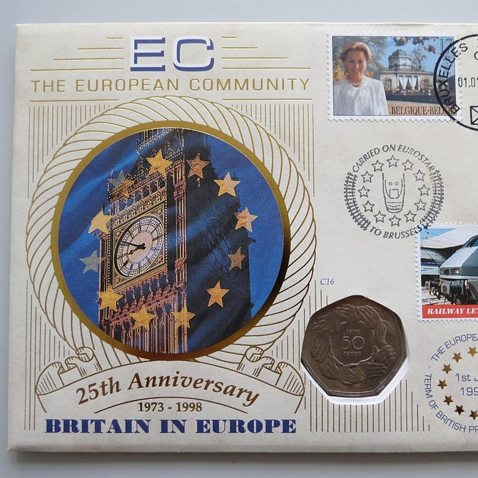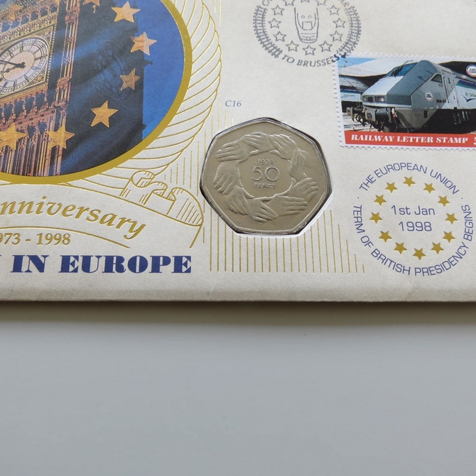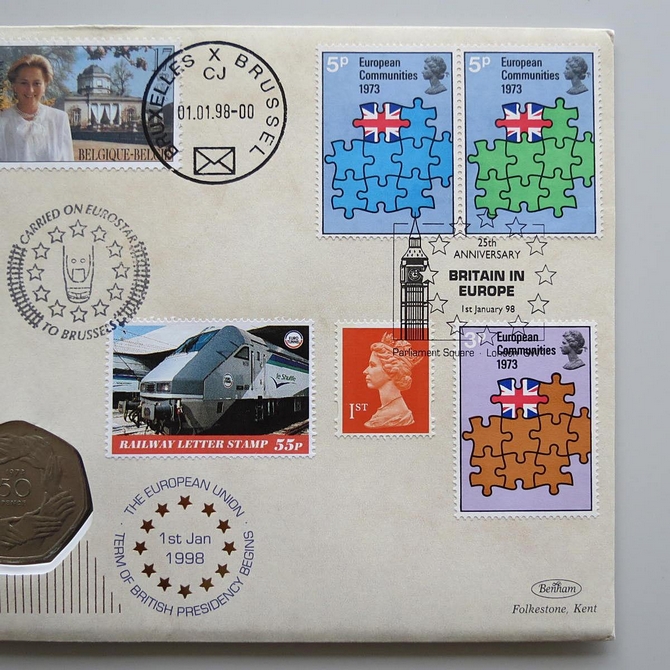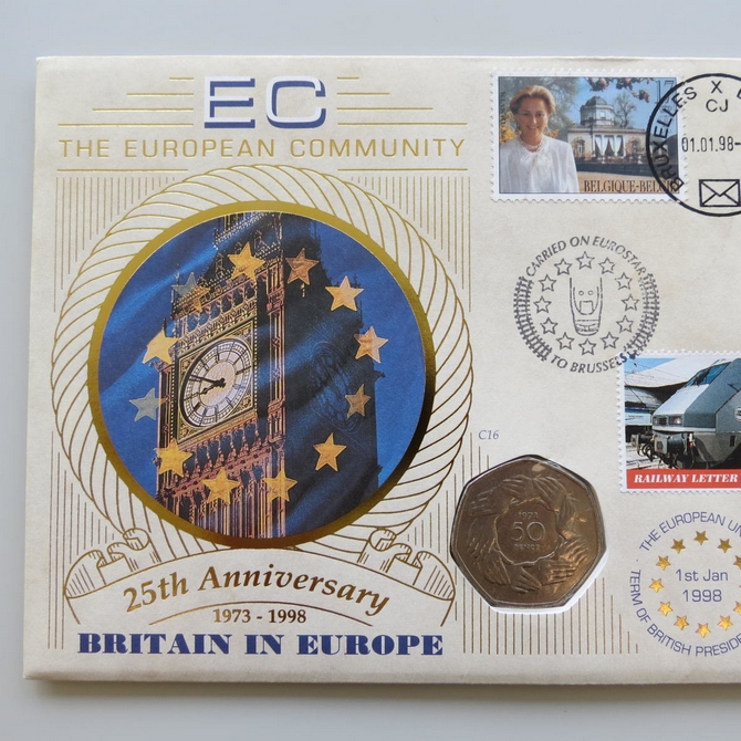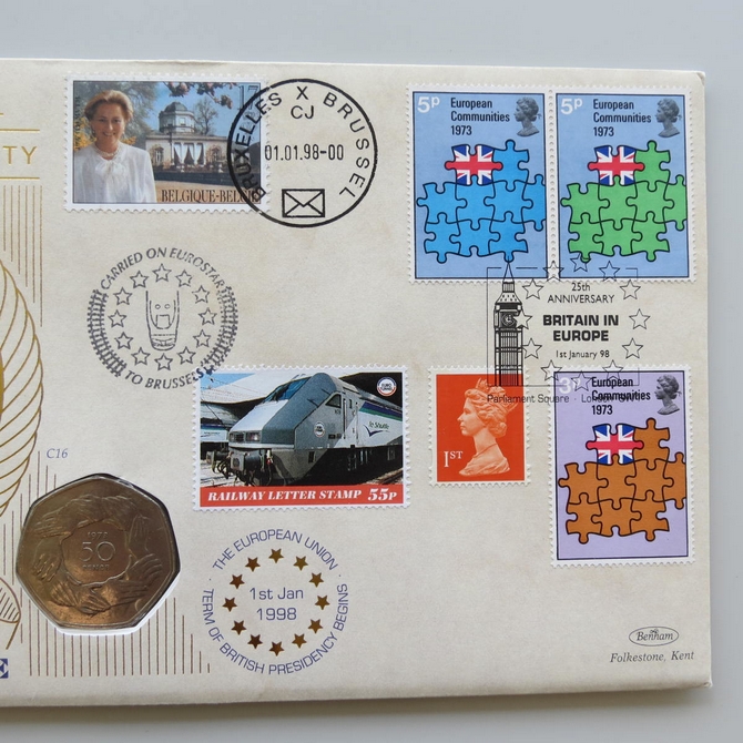 This 1998 25th anniversary Britain In Europe 50p pence coin cover is issued by Benham as First Day Covers in UK. It celebrates Britain being in the European Community and hosts a 50p pence coin by the Royal Mint and stamps by UK Royal Mail and Belgium. Cancelled postmark Britain In Europe 25th Anniversary 1st January 1998.