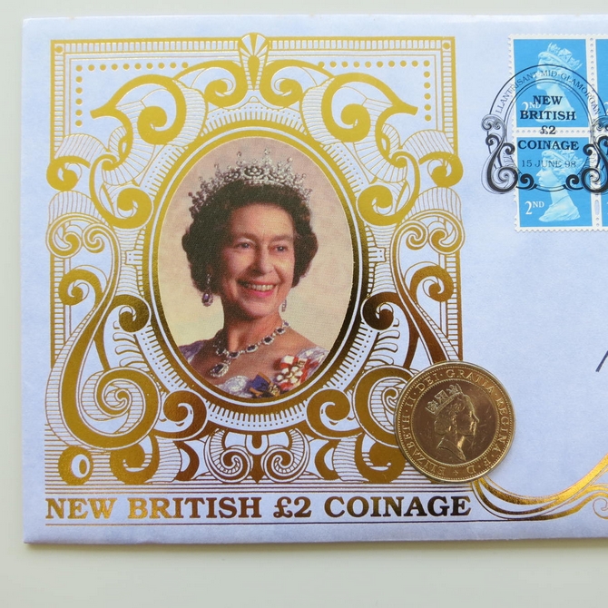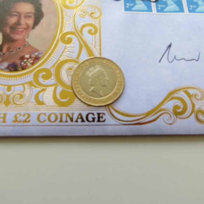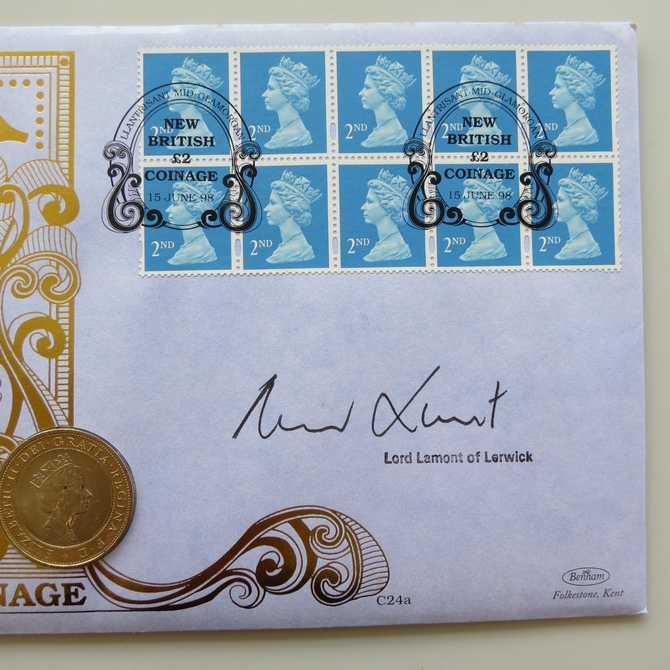 This 1998 new British 2 pound coinage coin cover is a signed Benham first day cover. It marks the introduction of the new British 2 pound coin and hosts a brilliant uncirculated two pound coin and Royal Mail stamps. The cover is hand signed by Lord Lamont of Lerwick. Cancelled postmark New British 2 Pounds Coinage Llantrisant Mid Glamorgan 15th June 1998.