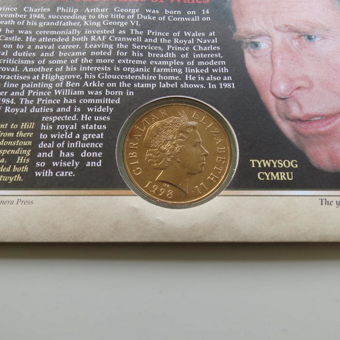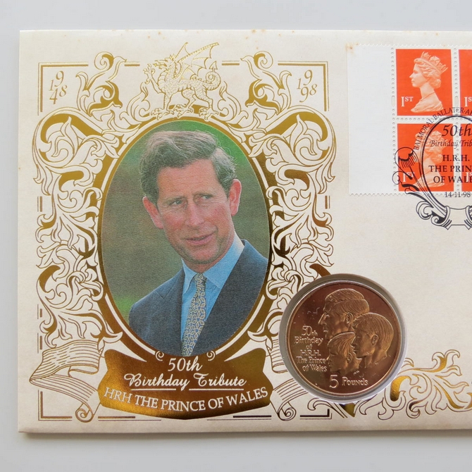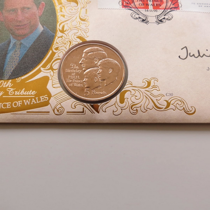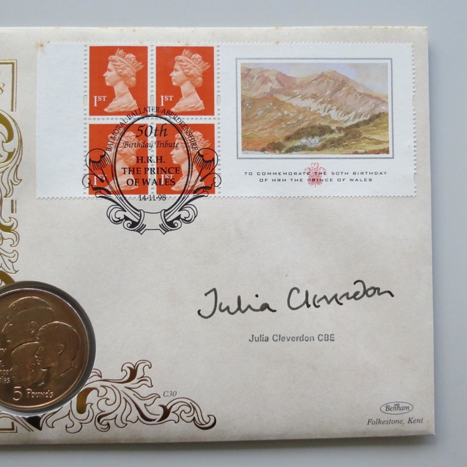 This 1998 Prince of Wales 50th birthday 5 pounds virenium coin cover is a Benham first day cover. It commemorates the Prince of Wales's 50th birthday and hosts a brilliant uncirculated 5 pounds coin and Royal Mail stamps. FDC is hand signed by Julia Cleverdon, a British charity worker. Cancelled postmark 50th Birthday Tribute HRH The Prince of Wales Balmoral Ballater Aberdeenshire 14th November 1998.