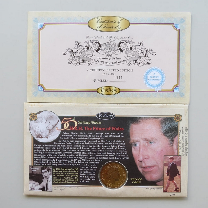 1998 Prince of Wales 50th Birthday 5 Pounds Virenium Coin Cover - Benham First Day Cover - Signed