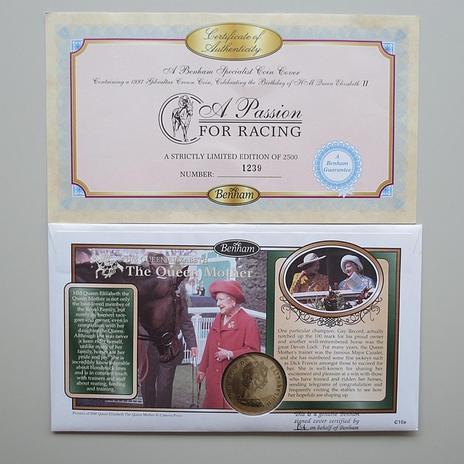 This 1998 Queen Elizabeth Passion For Horse Racing crown coin cover is a Benham first day cover. It celebrates the Queen Mother's interest of horse racing and hosts a brilliant uncirculated one crown coin and a Isle of Man stamp. FDC hand signed by Jenny Pitman. Cancelled postmark HM Queen Elizabeth The Queen Mother Castletown Isle of Man 4th August 1998.