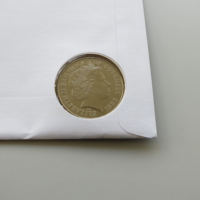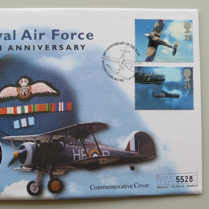 This 1998 Royal Air Force 80th anniversary 5 pounds coin cover is issued by UK as PNC first day covers. It commemorates the 80th anniversary of the RAF and hosts a brilliant uncirculated Guernsey five pounds coin and Royal Mail stamps. The coin depicts the Royal Air Force spitfires in action whilst the stamps show the Mitchell-Super Marine and Chadwick-Avro fighter planes. Postmark cancelled 80th Anniversary of the RAF Halton Camp Bucks 1st April 1998.
