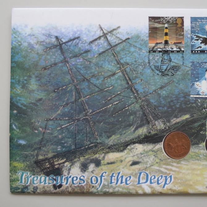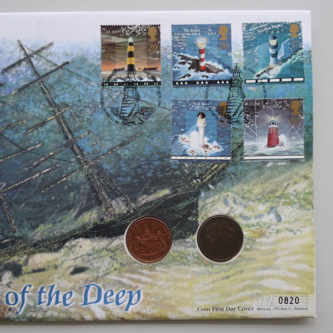 This 1998 Treasures Of The Deep East India Company twin 1808 coin cover is issured by UK as PNC first day covers. It hosts two shipwreck coins of 1808 by East India Company, treasures that were found in the deep ocean. The cover also marks the 300th anniversary of Eddystone lighthouse and features Royal Mail stamps of lighthouses across the British Isles. Cancelled postmark 300 Years of The Eddystone Lighthouse Plymouth 24th March 1998.