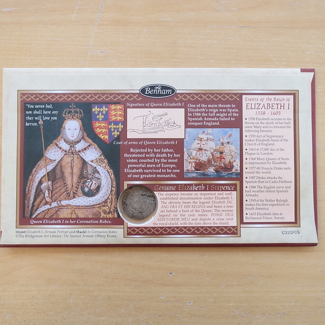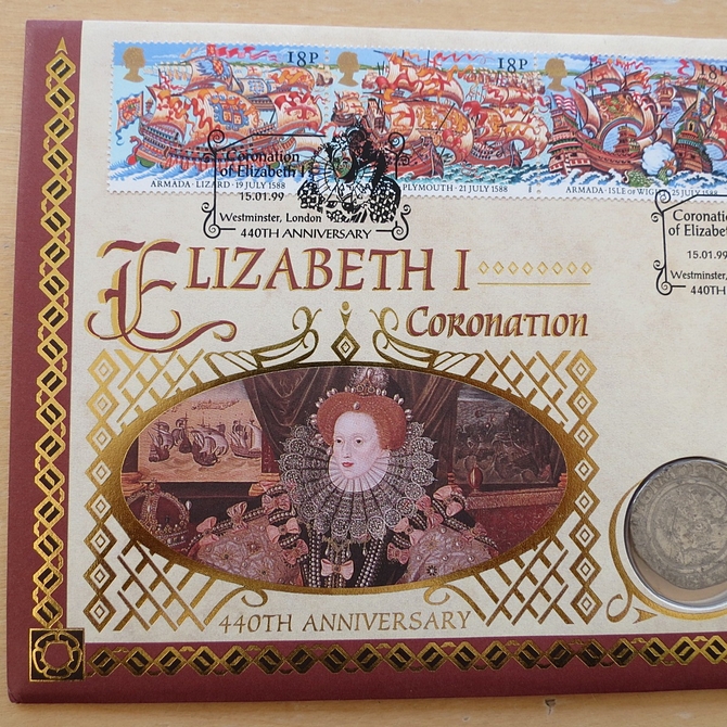 This 1999 440th Coronation anniversary Queen Elizabeth I sixpence coin cover commemorates 440th year of her Coronation in 1558. The Benham first day cover houses an original sixpence of her reign and a stamp cachet illustrating the battle with the Spanish Armada. Cancelled postmark Coronation of Elizabeth I Westminster London 440th Anniversary 15th January 1999.