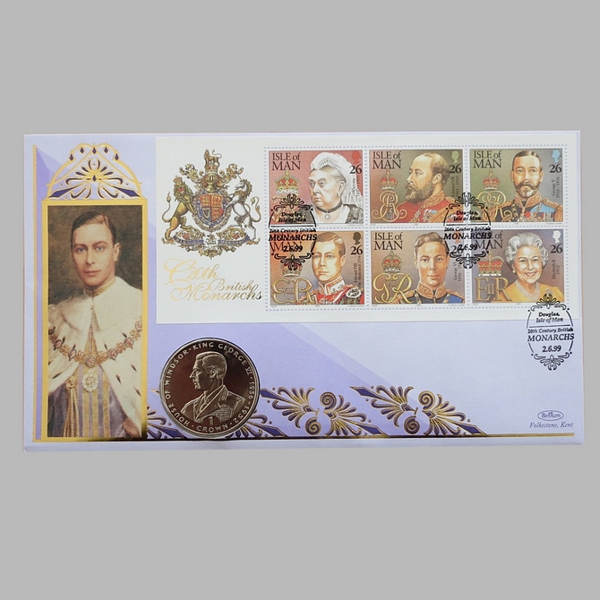 This 1999 King George VI 20th Century British Monarchs crown coin cover is a Benham first day cover. It commemorates King George VI's reign as a British Monarch and hosts a brilliant uncirculated one crown coin and Isle of Man stamps showing each monarch of the 20th century. Cancelled postmark 20th Century British Monarchs Douglas Isle of Man 2nd June 1999.