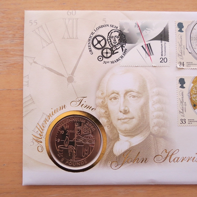 This 1999 Millennium Time John Harrison 5 pounds coin cover is a Mercury first day cover. It celebrates John Harrison and the new Millennium and hosts a brilliant uncirculated Gibraltar five pounds coin and Royal Mail stamps featuring time keeping. Cancelled postmark Greenwich London SE10 31st March 1999.