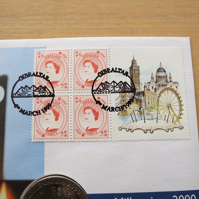 This 1999 Millennium Time Through History 5 pounds titanium proof coin cover is a Gibraltar first day cover by Mercury Covers. It commemorates the new Millennium and hosts a titanium 5 pounds coin and a stamp cachet showing key landmarks of London. Cancelled postmark Gibraltar 4th March 1999.