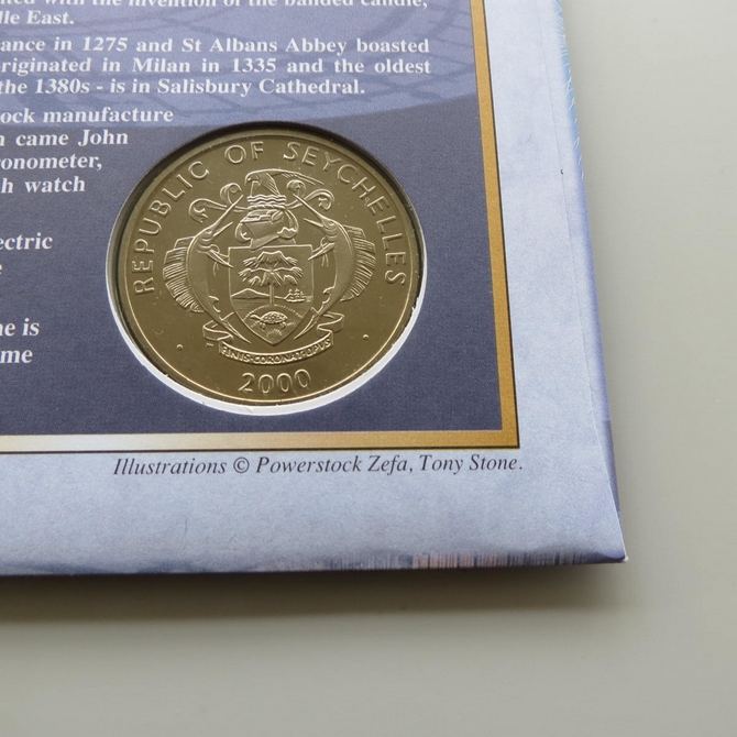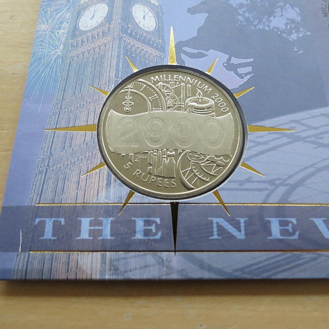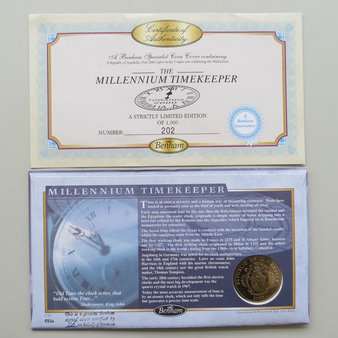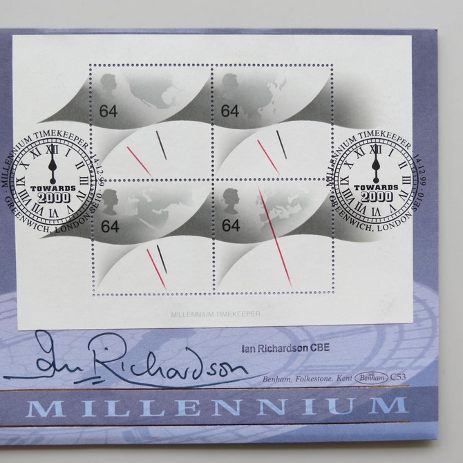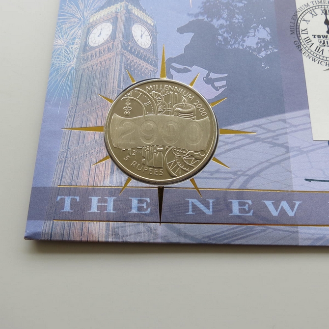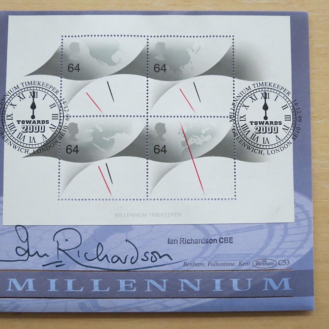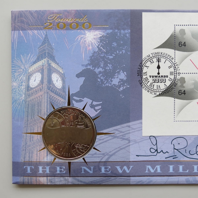 This 1999 Towards 2000 New Millennium 5 Rupees coin cover is a Benham signed first day cover. It celebrates the arrival of the new millennium and hosts a brilliant uncirculated Seychelles 5 Rupees coin and Royal Mail stamps. The cover is hand signed by Ian Richardson. Cancelled postmark Millennium Timekeeper Towards 2000 Greenwich London SE10 14th December 1999.