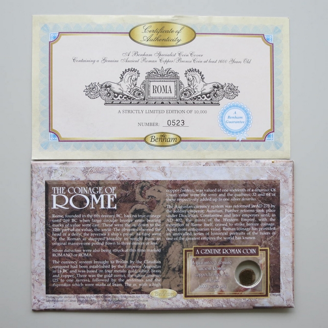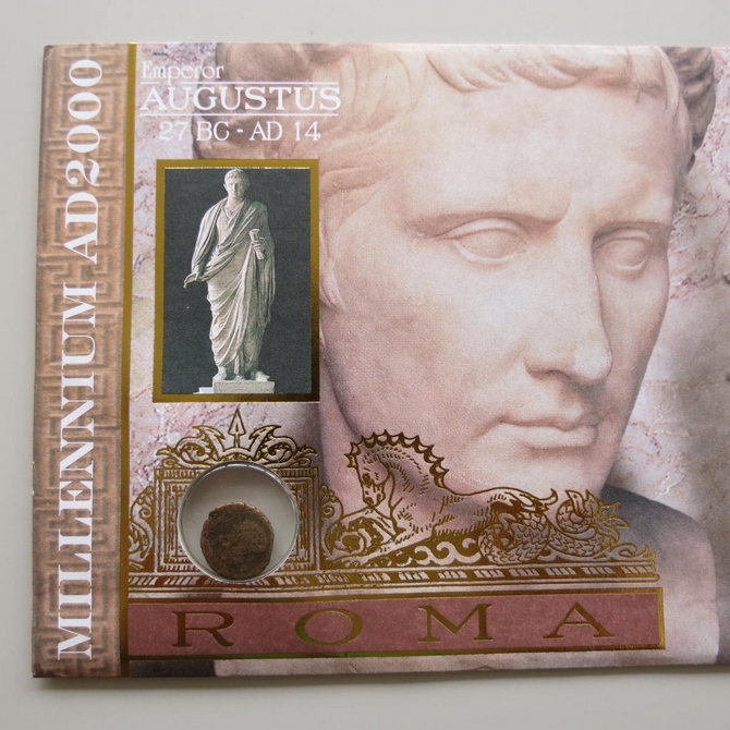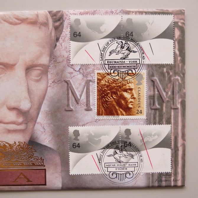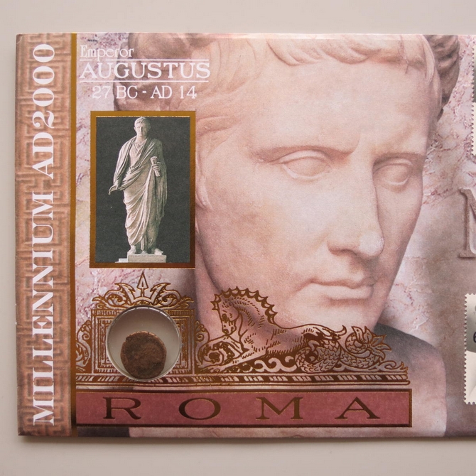 This 2000 Emperor Augustus Roman copper bronze coin cover is a Benham first day cover. It celebrates the arrival of the new millennium and the Roman Emperor Augustus hosting an ancient roman copper bronze coin and Royal Mail stamps. The coin is at least 1600 years old. Dual cancelled postmark: Last Day of the Second Millennium Eburacum York and First Day of the Third Millennium Aquae Sulis Bath 1st January 2000.