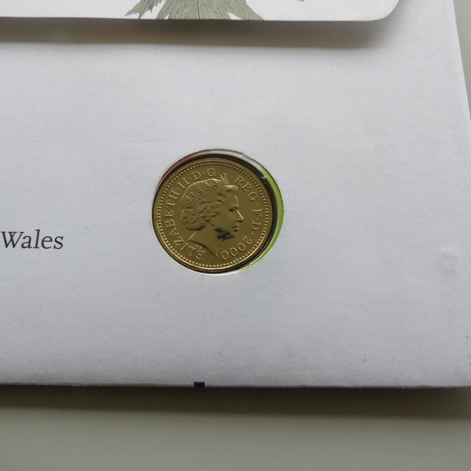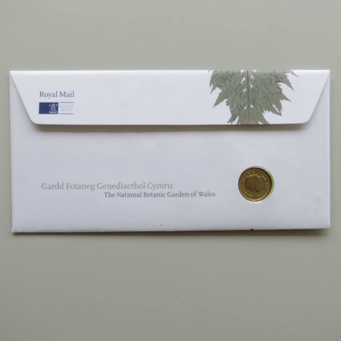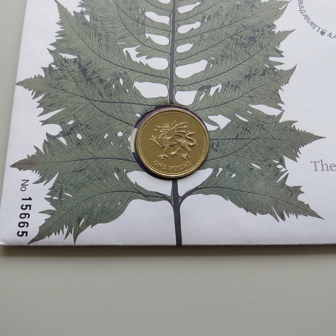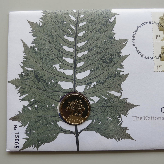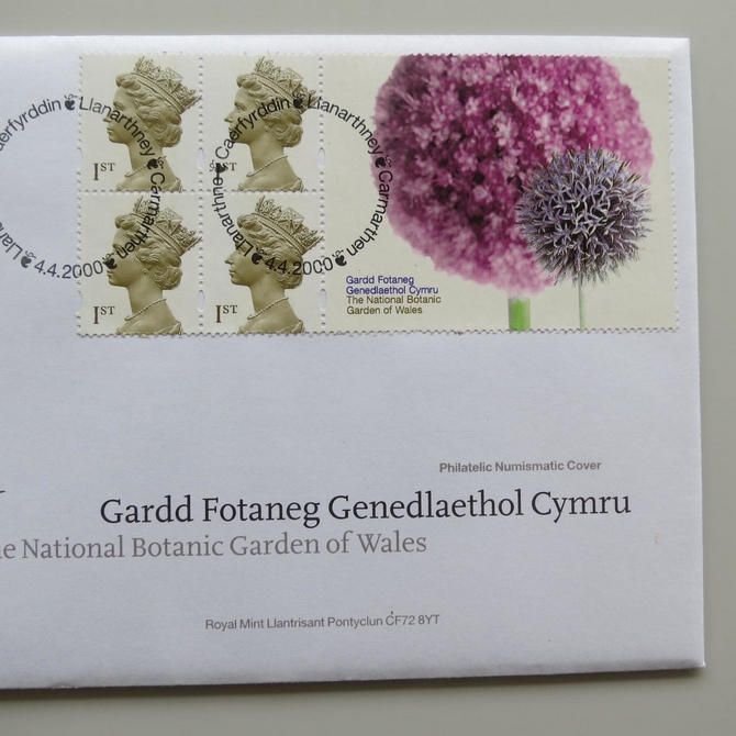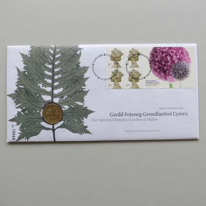 This 2000 The National Botanic Garden of Wales 1 pound coin cover is issued by Royal Mail as first day covers. It commemorates William Paxton's botanic garden in Wales and hosts a Welsh brilliant uncirculated one pound coin and Royal Mail commemorative stamps. Cancelled postmark Llanarttne Caerfyrddin Llanarthney Carmarthen 4th April 2000.