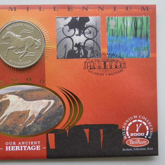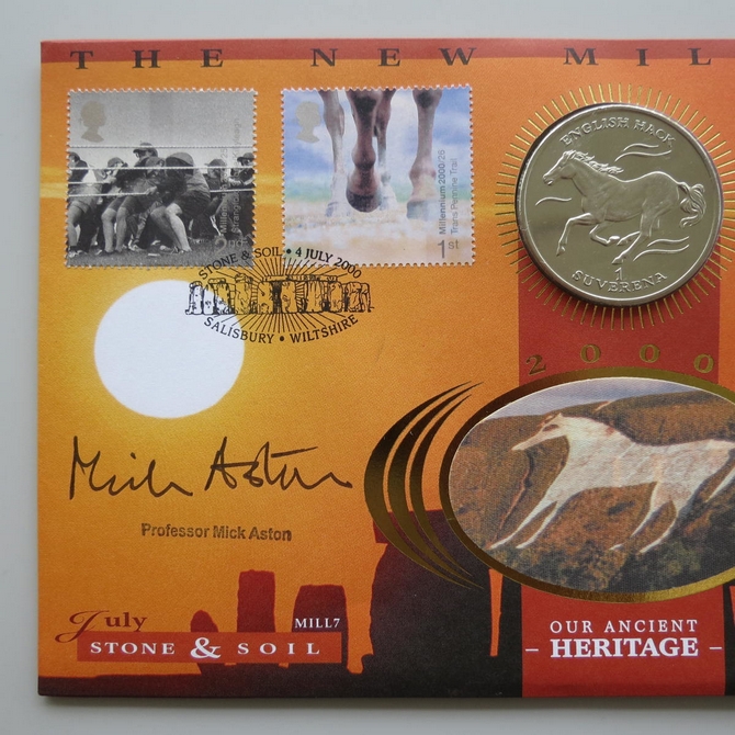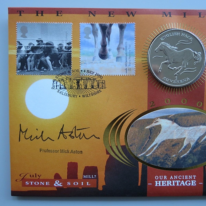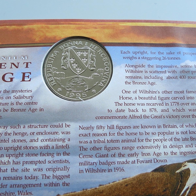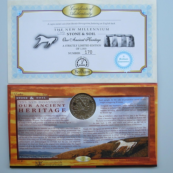 This 2000 The New Millennium Our Ancient Heritage Bosnia coin cover is a signed Benham first day cover. It is named Staone and Soil issued in July 2000 and hosts a brilliant uncirculated 1 Herce coin and Royal Mail stamps. The cover is hand signed by XProfessor Mick Aston. Cancelled postmark Stone and Soil Salisbury Wiltshire 4th July 2000.