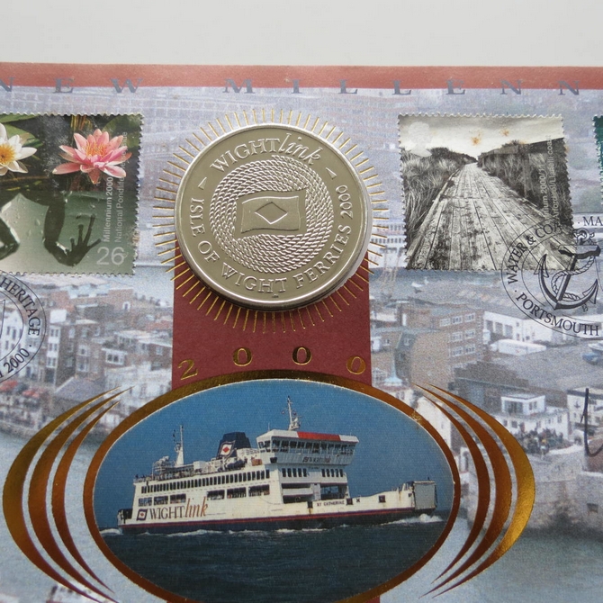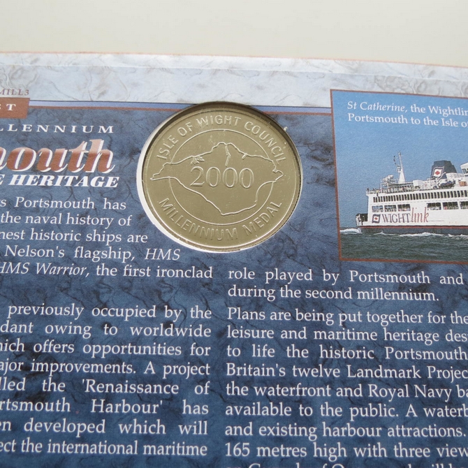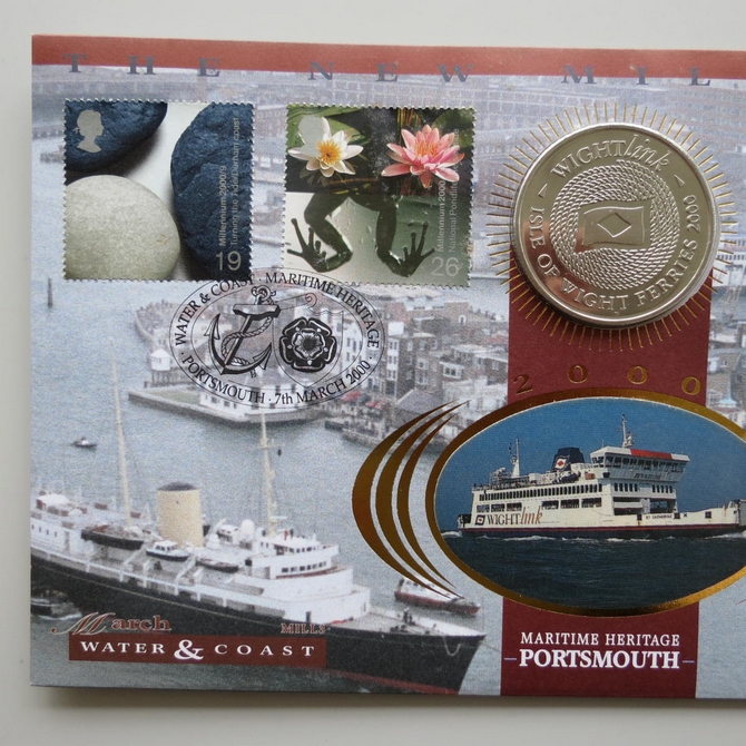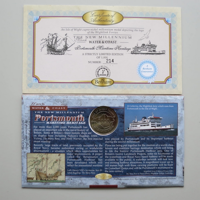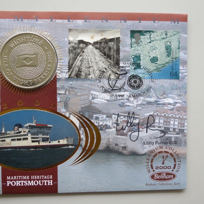 This 2000 The New Millennium Maritime Heritage Portsmouth medal cover is a signed Benham first day cover. It is named Water and Coast issued in March 2000 and hosts a Isle of Wight medal and Royal Mail stamps. The cover is hand signed by Libby Purves. Cancelled postmark Water and Coast Maritime Heritage Portsmouth 7th March 2000.
