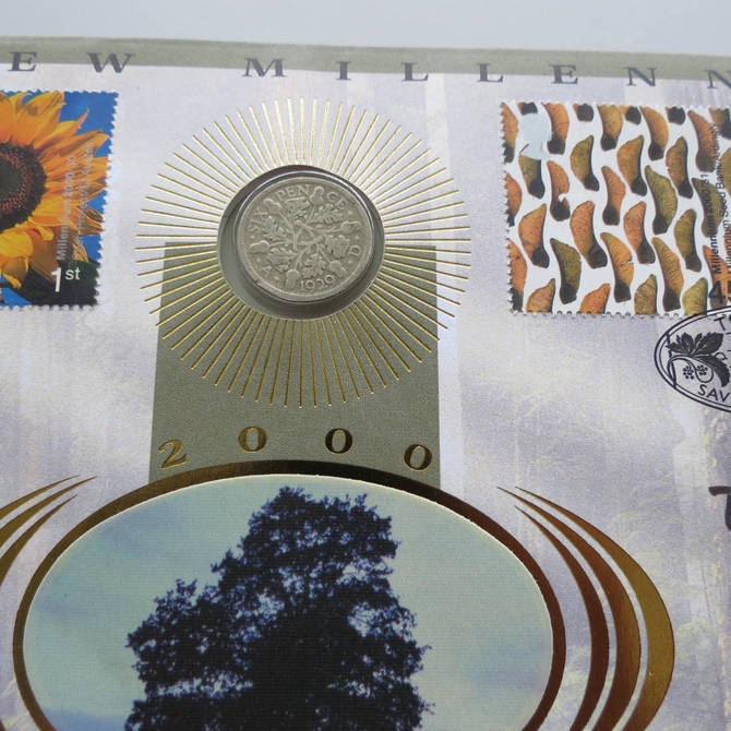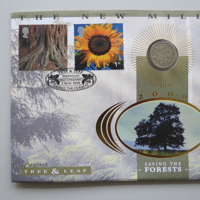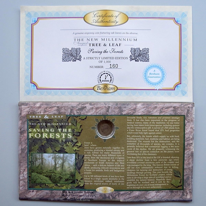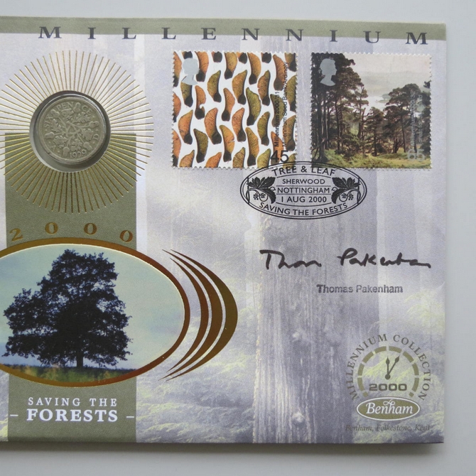 This 2000 The New Millennium Saving The Forest sixpence coin cover is a signed Benham first day cover. It is named Tree and Leaf issued in August 2000 and hosts a 1929 King George V sixpence coin and Royal Mail stamps. The cover is hand signed by Thomas Pakenham. Cancelled postmark Tree and Leaf Saving The Forests Sherwood Nottingham 1st August 2000.
