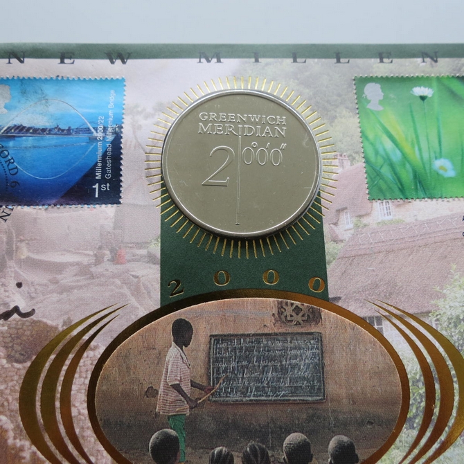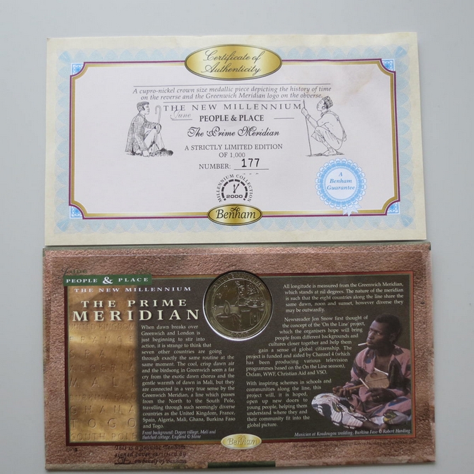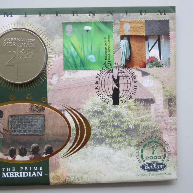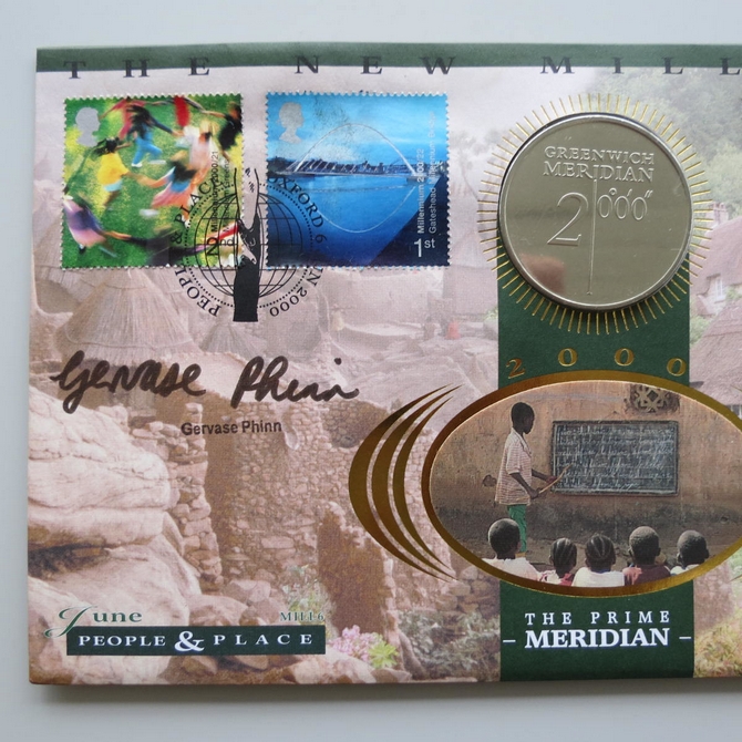 This 2000 The New Millennium The Prime Meridian medal cover is a signed Benham first day cover. It is named People and Place issued in June 2000 and hosts a medal and Royal Mail stamps. The cover is hand signed by Gervase Phinn. Cancelled postmark People and Place Oxford 6th June 2000.