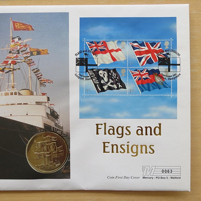 This 2001 Flags and Ensigns 5 pounds coin cover is a UK first day cover. It celebrates the flags and ensigns of naval ships and hosts a brilliant uncirculated 5 pounds coin by the Royal Mint and Royal Mail stamps. Stamp cancelled postmark Flags and Ensigns Gosport Hampshire 22nd October 2001.