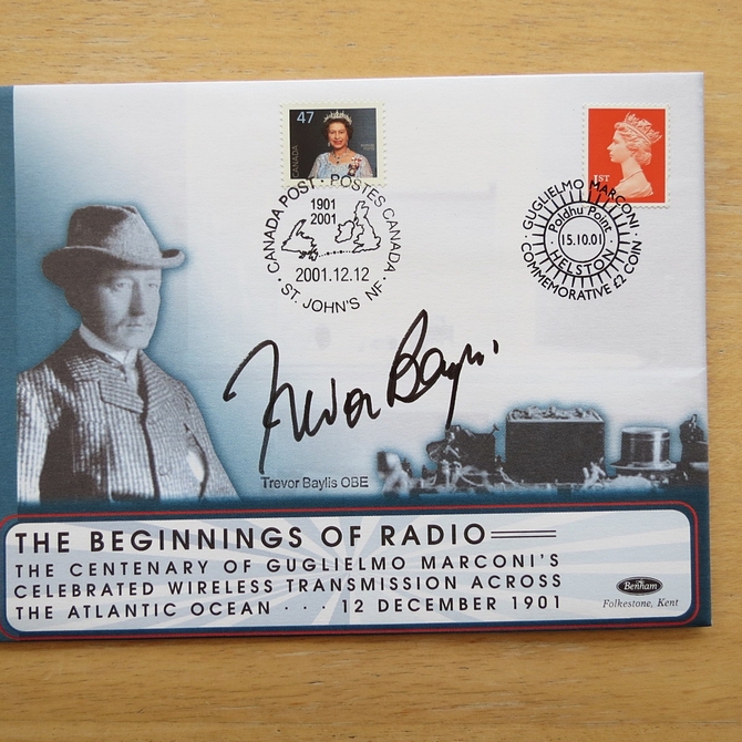 This 2001 Marconi Beginnings of Radio centenary 2 pounds coin cover is a Benham first day cover. It commemorates 100 years since Marconi's wireless radio transmission across the Atlantic Ocean and hosts a brilliant uncirculated two pounds coin by the Royal Mint and Royal Mail stamps. FDC hand signed by Trevor Baylis, the wind-up radio inventor. Cancelled postmark Guglielmo Marconi Poldhu Point Helston 15th October 2001 and Canada Post St. Johns NF 12th December 2001.